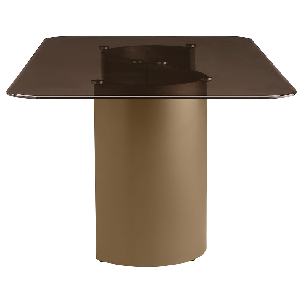 Dining table with semi-opaque tempered glass top in tawny finish and rounded corners
