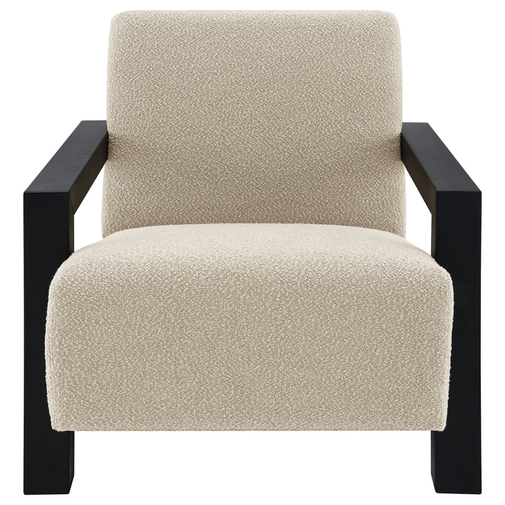 Exposed wood armrests add a sense of precision and structure to a modern accent armchair. It's a fresh, refined look with a neutral palette and minimalist allure. A slightly reclined seat and back create an inviting silhouette for the chair, which blends beautifully in personal and professional settings. Boucle upholstery is fresh and contemporary, offering impressive texture and depth. Add an accent pillow for a splash of color that coordinates with surrounding decor.