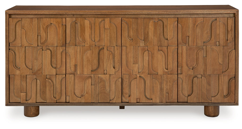 Sure to make a gorgeous statement, this accent cabinet is a work of art. From the geometric cutout pattern on the door fronts to the beautiful honey brown finish, this piece is style and function at its best. Push magnet doors open to reveal two shelves for all your storage needs. It'll be the envy of neighbors—and the pride of your home.