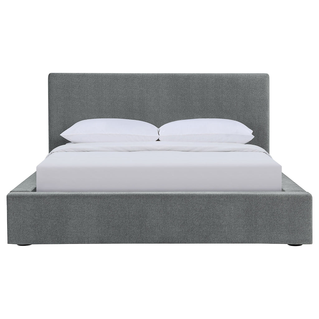 Basic design principles reflect elegant simplicity in this stylish platform bed, an ideal choice for a sophisticated and uncomplicated bedroom space. Modern in motif, its clean lines and textured gray fabric upholstery deliver both versatility and class. This bed offers a seamless padded headboard, and padded side rails and footboard, adding up to an ideal mattress enclosure without the need for a box spring. Pine wood and plywood construction offer a steady build to this tasteful bed. Includes subtle black finish feet.