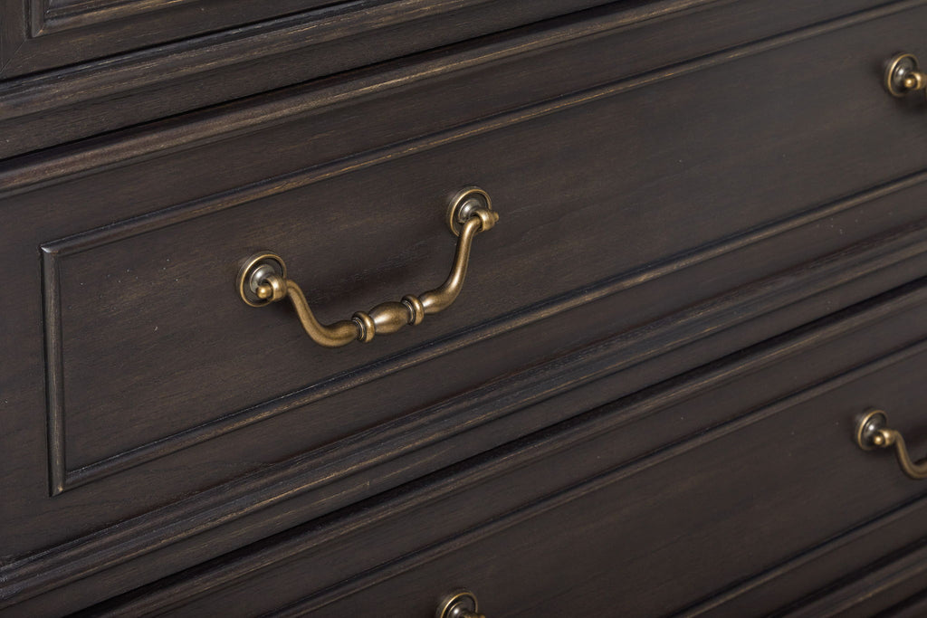 - Custom bail pulls and knobs in an aged bronze finish enhance the overall appeal, reinforcing the heritage-inspired, masculine design