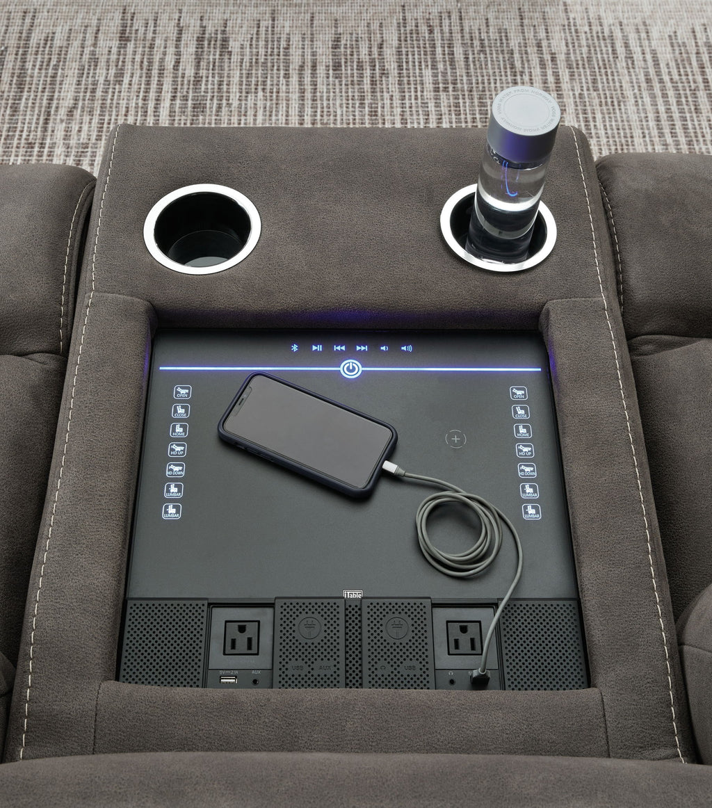 Stylish in design and function, this power reclining sectional with console creates a comfortable place to gather with family and friends. The sectional, upholstered in heavyweight faux leather with quilting and jumbo stitching, invites you to sink into plush opulence at an affordable price. The zero-wall power reclining mechanism features infinite positions for comfort. Conveniently plug in your devices to the USB charging station. Appealing to those with an eye for sumptuous design and high-tech features, this gunmetal gray sectional will always be a win.