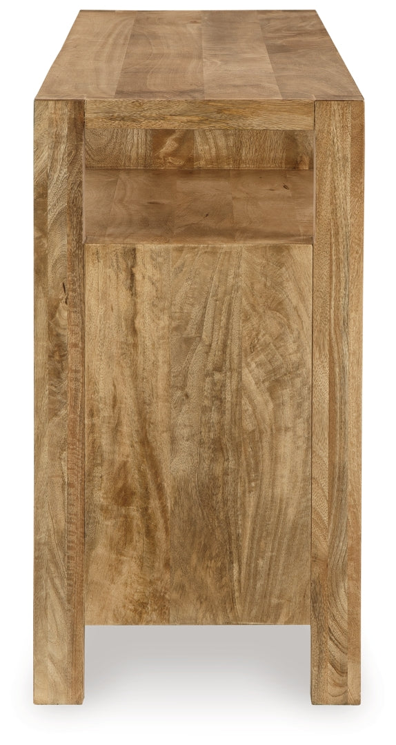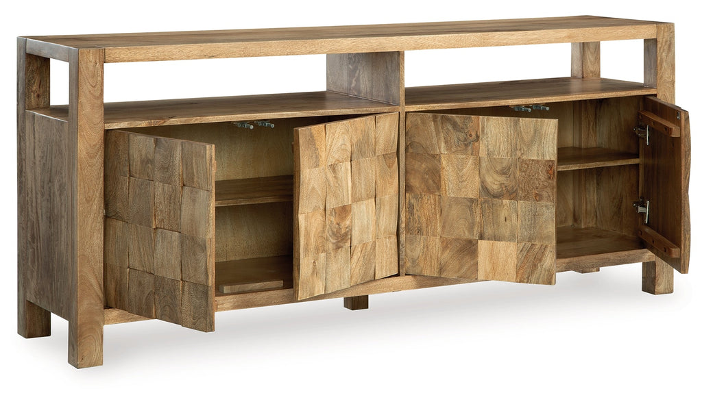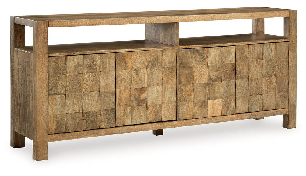 How many squares do you see? They’re laid out in casually cool style on this accent cabinet. The block-patterned door fronts and natural brown finish add dimension and a laid-back aesthetic to your storage needs. Look behind the push magnet doors for two adjustable shelves, giving function to form. (We counted 64 squares, by the way.)