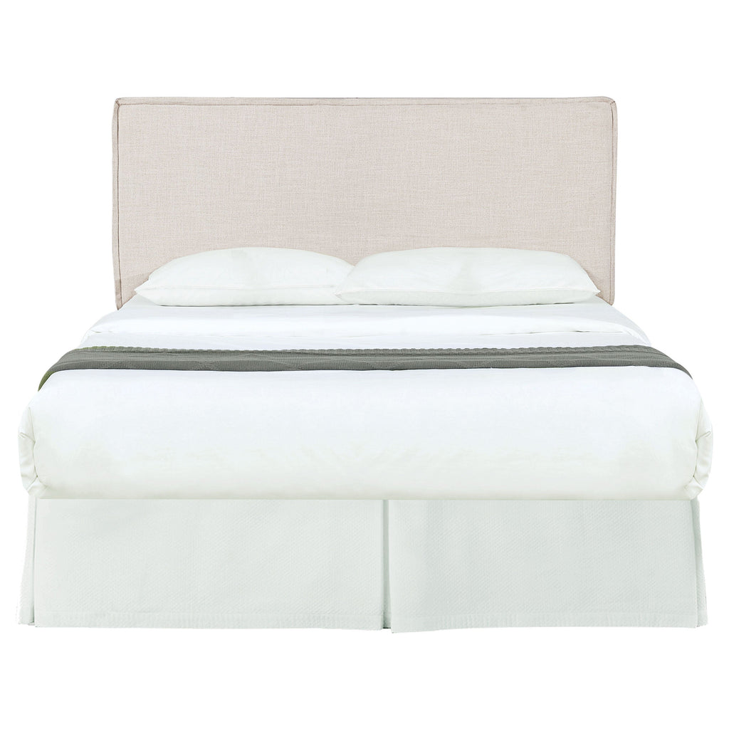 Inspire modern artistry in a contemporary bedroom space with a headboard that shines as a focal point. This updated headboard creates a mix of clean lines and tempting upgrades to transform a bedroom into a haven for relaxation. Versatile and timeless, flange details dress up the outer border, adding a dimensional effect. Textured sand finish fabric wraps over the headboard to deliver a light essence and a palette that accommodates a variety of options for matching case pieces, beds, and accessories. Constructed of pine wood.