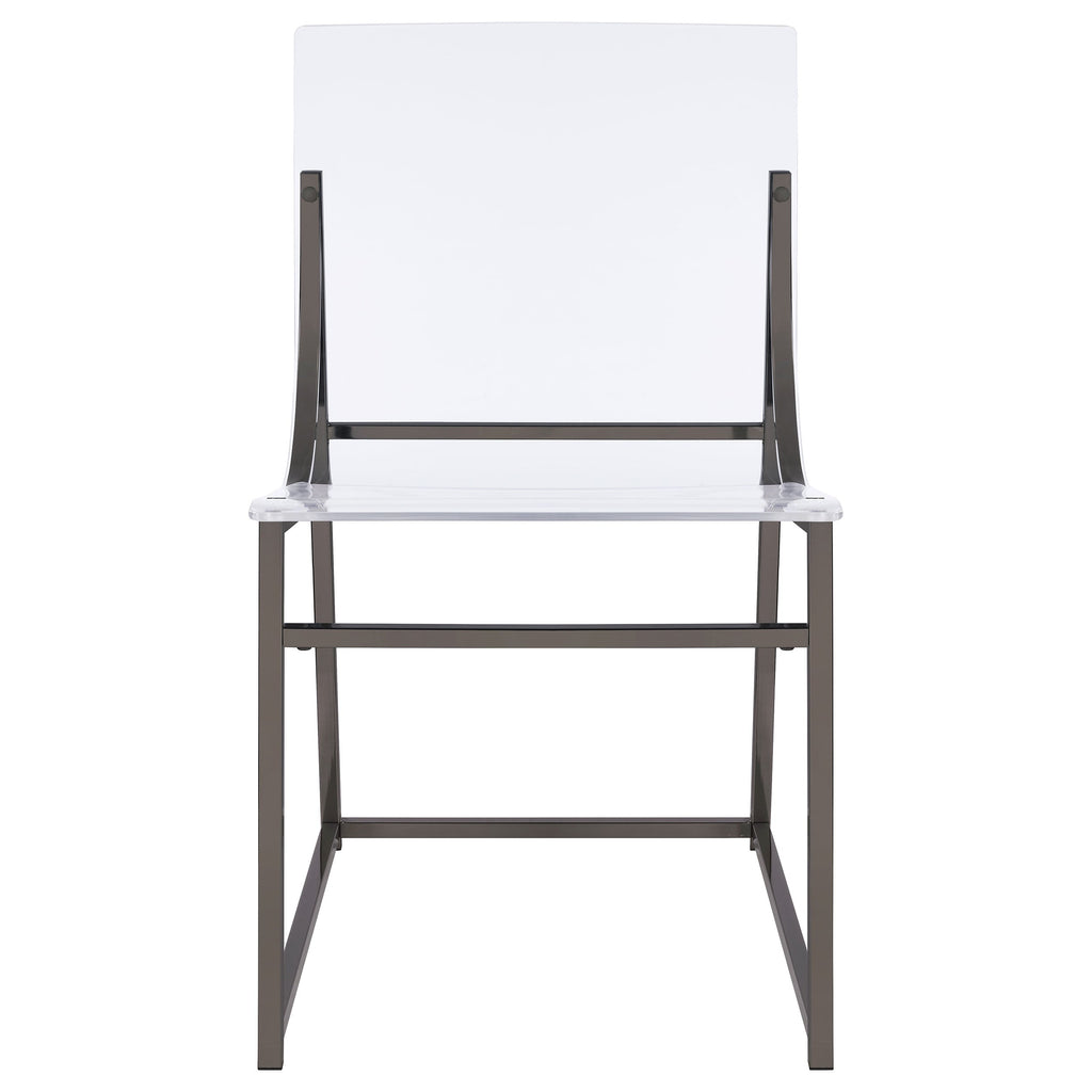 Elevate your dining experience with this striking five-piece dining set, blending contemporary design with modern elegance. The centerpiece is a round dining table, featuring a sleek mirror glass tabletop and supported by angular, open frame legs that add a touch of geometric flair. Complementing the table are four avant-garde dining chairs that redefine modern style with their clear acrylic backs and minimalist metal frames. The black nickel finish of the table and chairs enhances the set's sophisticated appeal, making it perfect for both casual meals and elegant entertaining. Whether hosting dinner parties or enjoying a quiet meal, this dining set transforms your space into a chic dining oasis.
