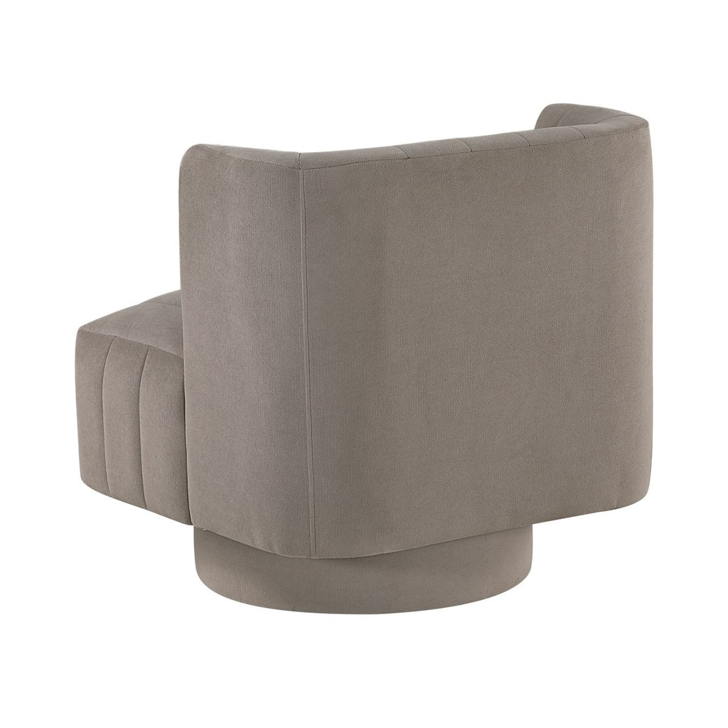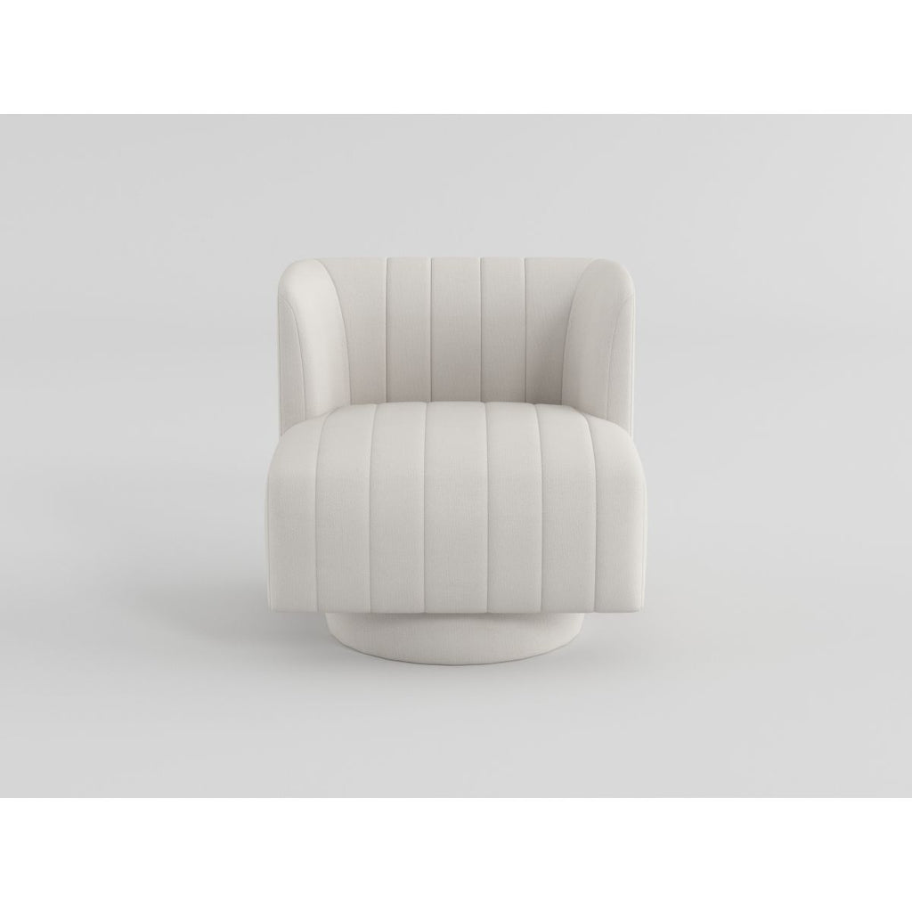 This chic modern swivel chair, upholstered in a luxurious textured fabric with stylish channel tufted details, offers a perfect blend of comfort, functionality, and contemporary design for your living space. Its unique barrel back design and attached seat cushion provide inviting comfort, while the robust plywood frame and metal swivel base ensure stability and smooth 360-degree rotation. Ideal as an accent chair or a functional seating option, this piece adds a touch of modern elegance and versatility to any room. Assembly is required to bring this delightful and dynamic chair into your home.