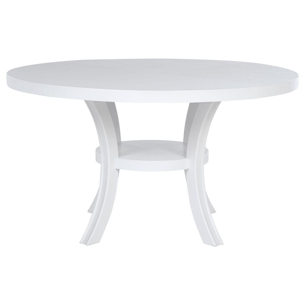 Freshen up your breakfast nook with the clean, modern presentation of a round dining table. It's a simple, engaging look that features a roomy round tabletop and a cool white finish. The table boasts a square edge and stands on flared legs unified with a single round shelf. The shelf is an easy spot for decor or essentials and creates a cohesive look and feel. Legs feature subtle ribbing that adds texture and dimension.