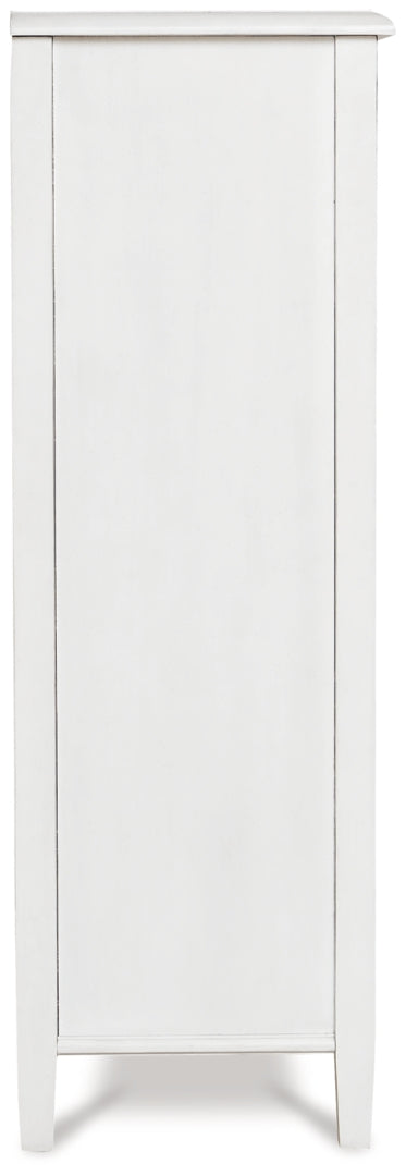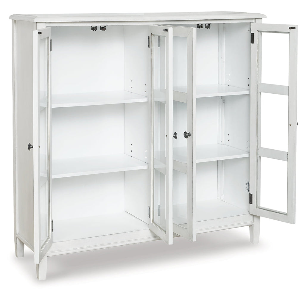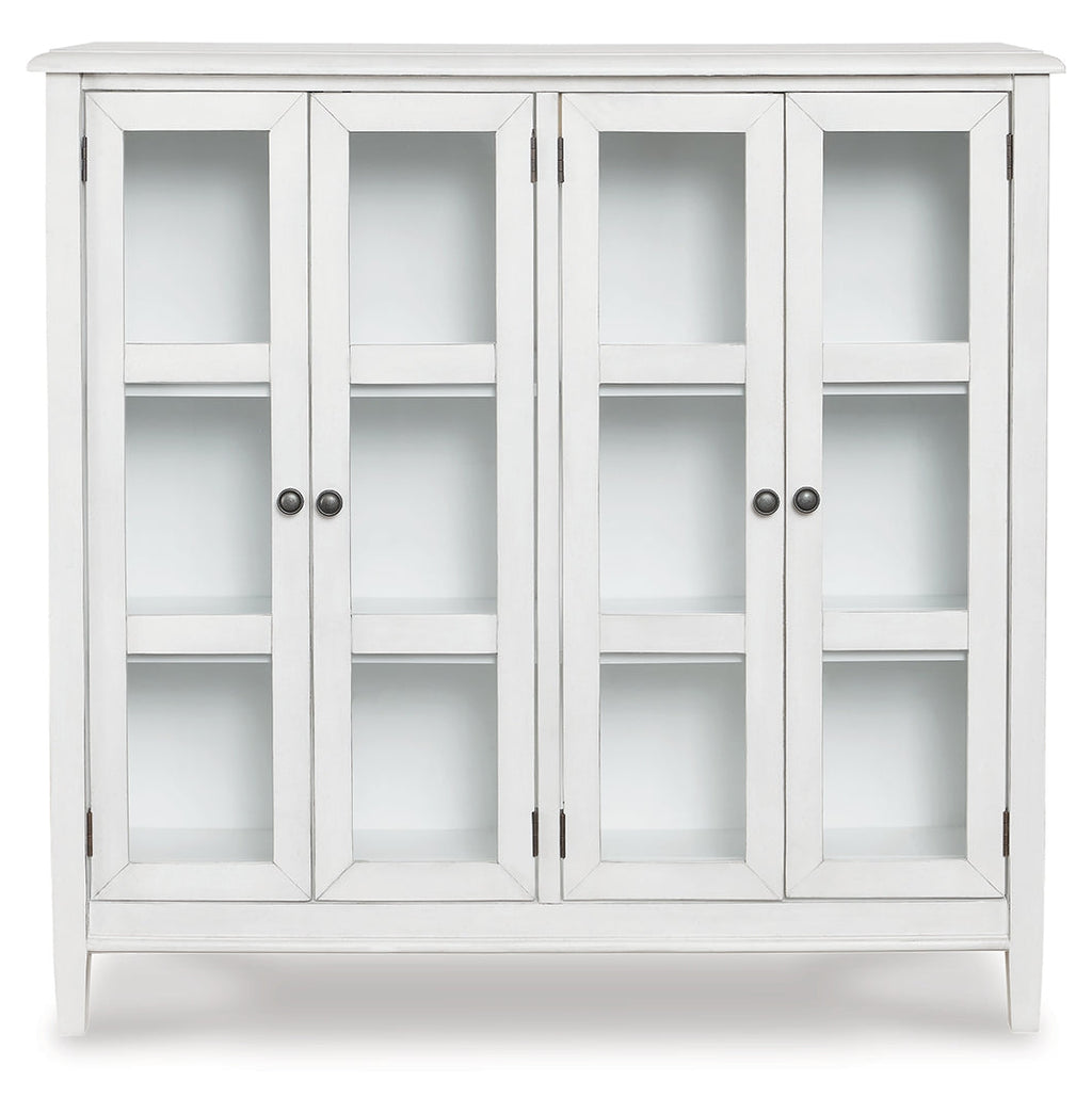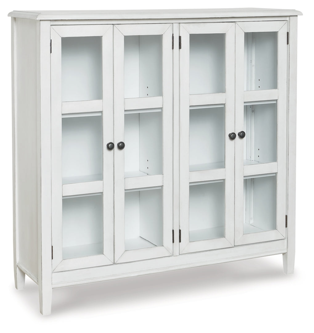 Give your home vintage charm and valuable storage with this stunning accent cabinet. Two shelves behind glass-front doors will help you display your favorite dinnerware or books in casual style. Its simple farmhouse design and beautifully distressed whitewash finish evoke the feel of a quaint cottage escape.