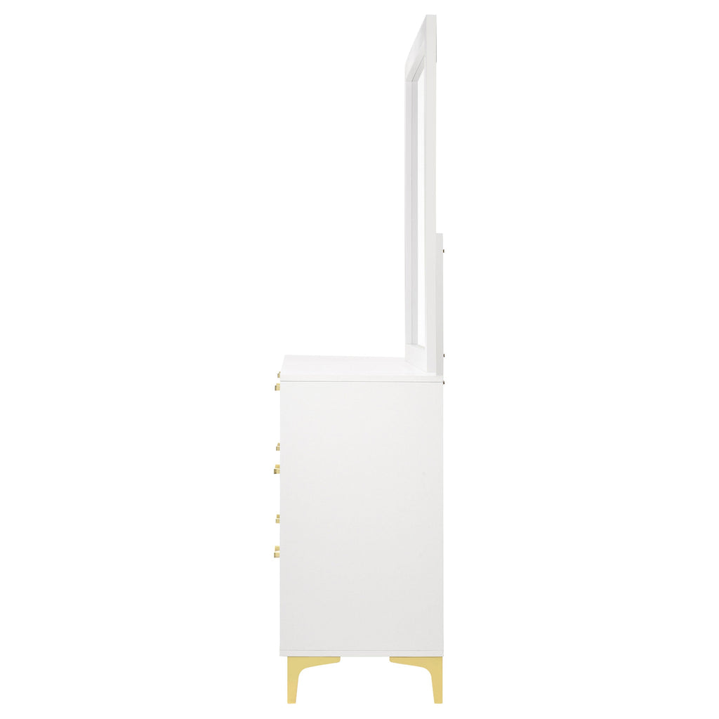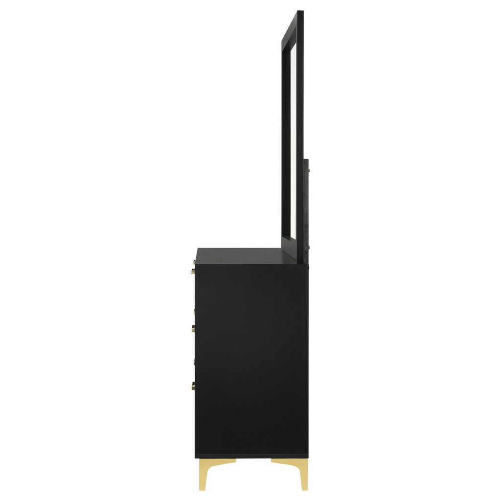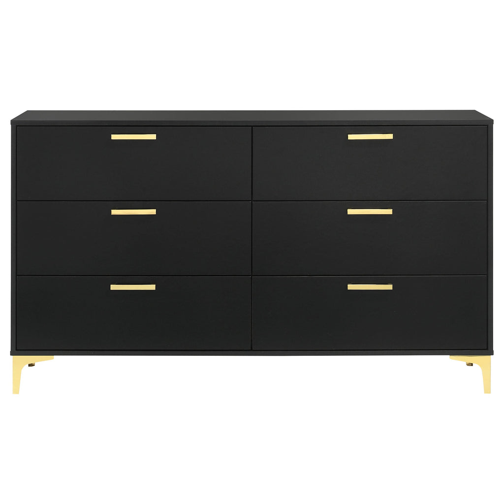 Space-saving and elegantly understated, this modern glam dresser offers plenty of space to store all wardrobe items. A boxy frame with a smooth black finish presents a bold, handsome look and creates a striking focal wall. Six spacious drawers make room for pajamas and garments, keeping your top surface neat and tidy. Each drawer is adorned with a slender gold pull handle that offers a sleek metallic accent. Gold finished bracket legs mirror the hardware, offering a unified look and feel.