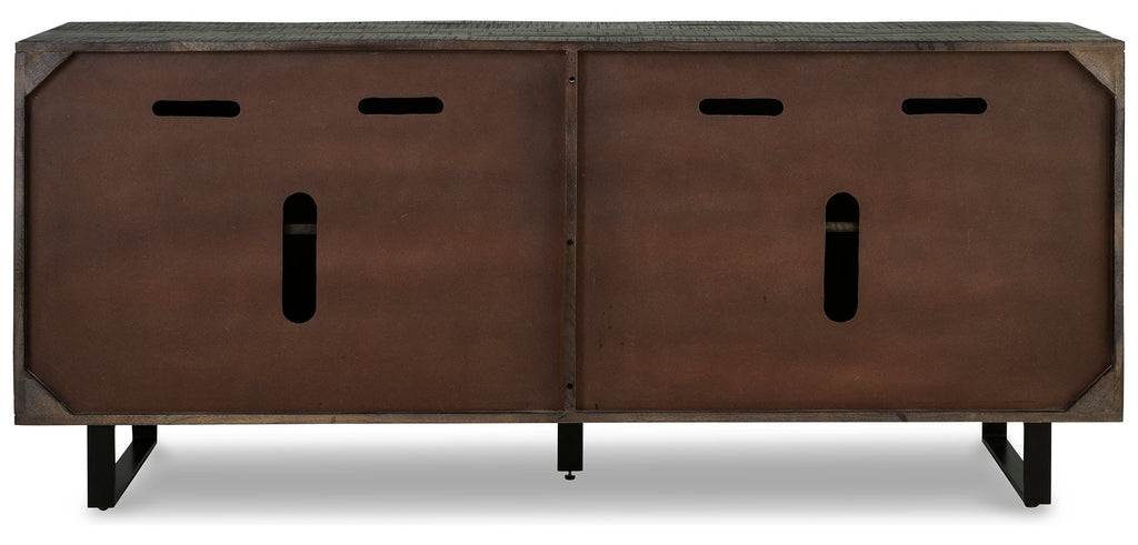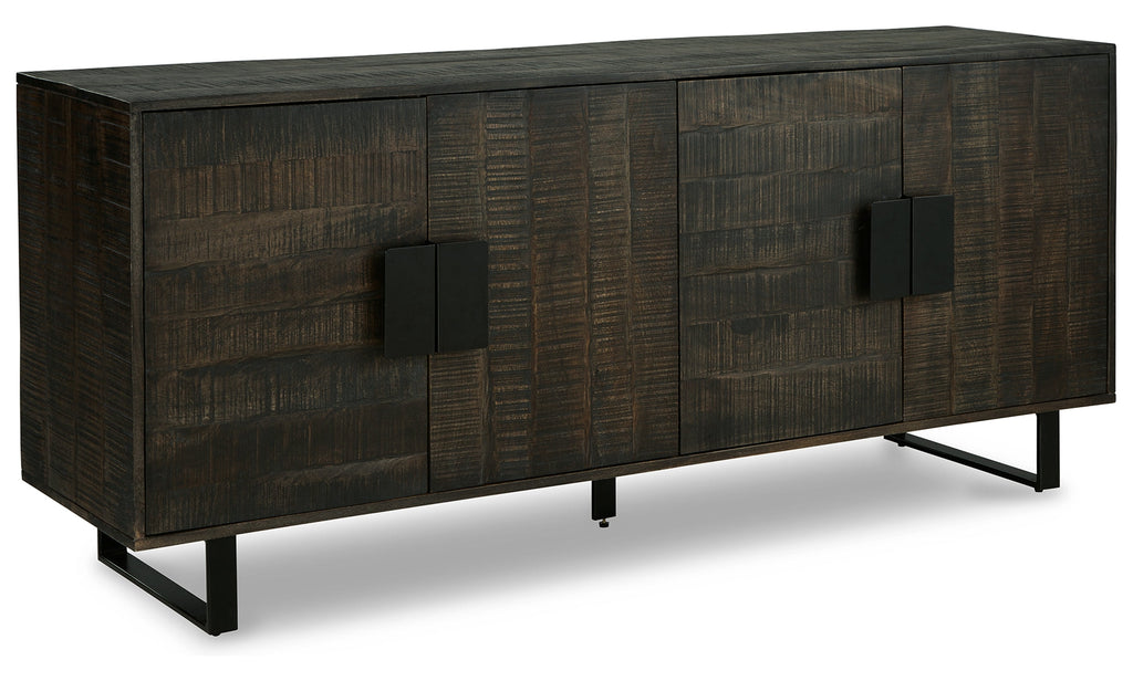 This accent cabinet has a mixed-material look that seamlessly slips into any contemporary scene. It impresses with the raw beauty of its saw mark effect and grayish brown glaze. Sleek black metal hardware provides visual balance. With two shelves behind the pair of double doors, this piece gives you storage and superior style all in one.