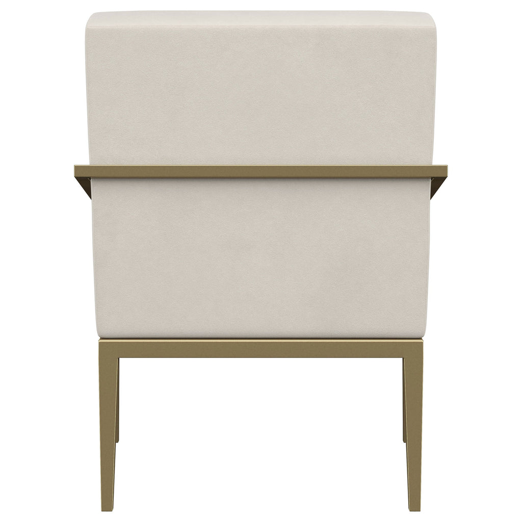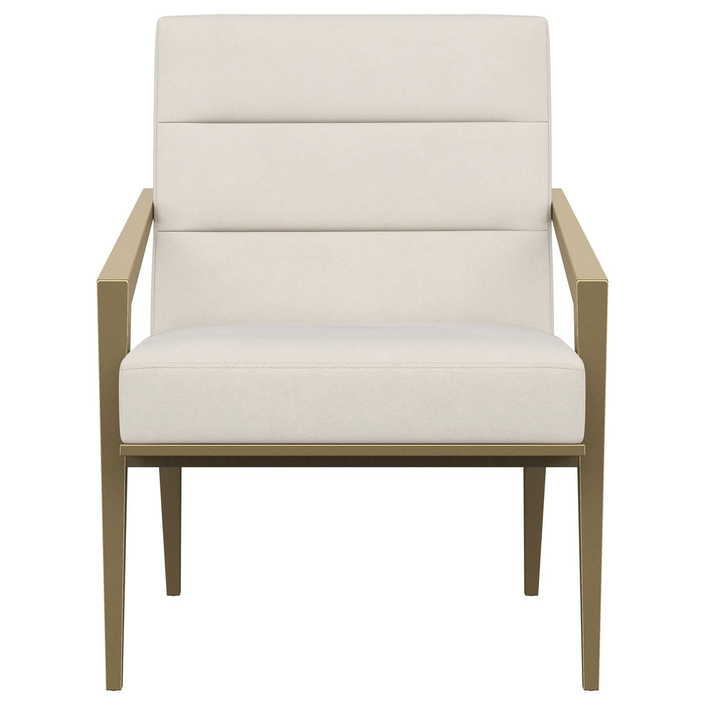 Restrained, modern style meets elegant artistry in a striking contemporary armchair. Designed to stand out, it boasts an upholstered seat and back with a metal frame and arms. The streamlined look receives a gleaming gold finish, adding sophistication anywhere from a sophisticated living room to a refined reception area in a professional space. Sloping, tapered arms define its silhouette, creating an accent chair that's sure to stand out. Channel tufting accents foam cushions, creating a sense of depth and dimension you'll appreciate in any setting.