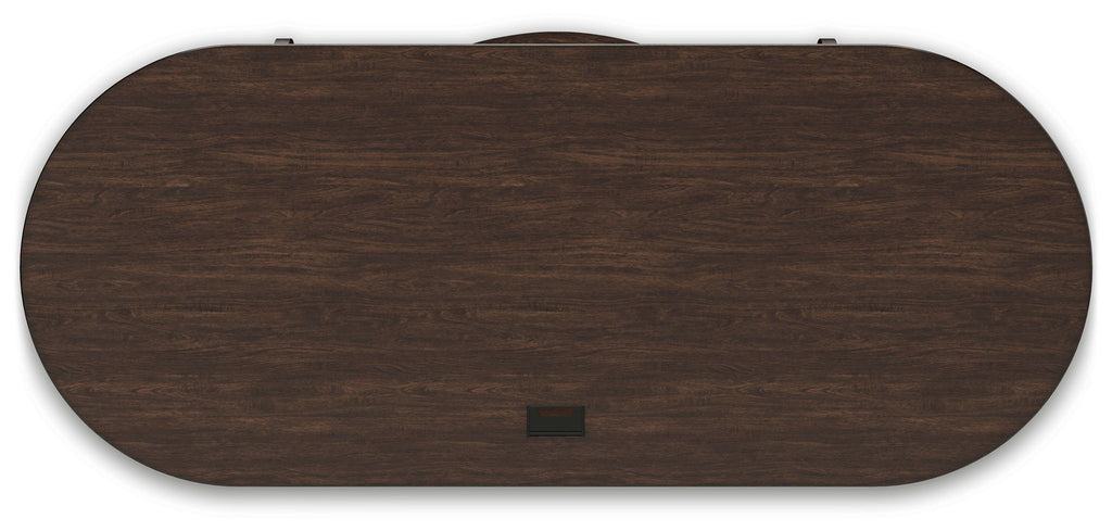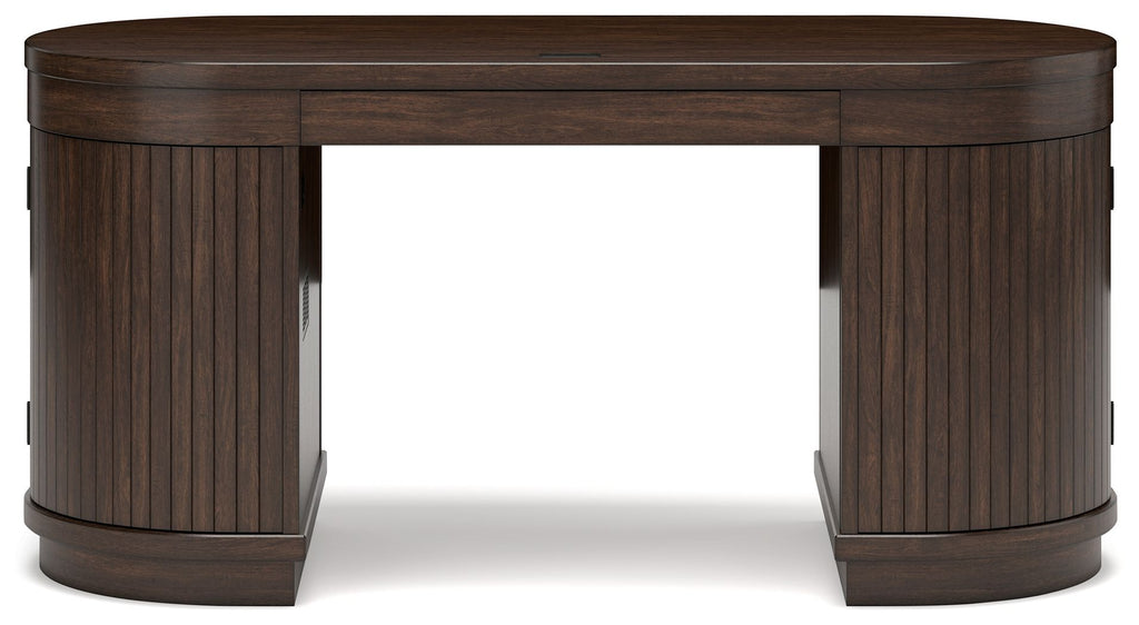 This home office desk is perfectly modern in every way. Finished on both sides in a rich wood tone, it can be floated in a room or used as a divider. Two half round door cabinets, each with an adjustable shelf, deliver a well-organized space for work-from-home professionals. It's a striking study in upscale contemporary form and function.