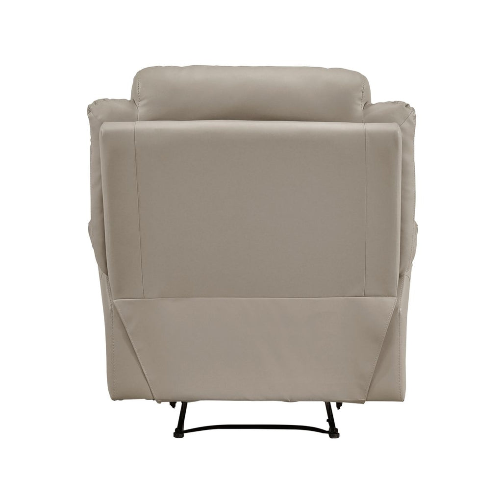 Designed with stylistic versatility and comfort in mind, the Laconia Collections addition to your homes casual living room provides a comfortable gathering spot for your family and friends. The reclining chair is engaged with a pull of the side mounted tab. The transitional frame of the chair is covered in 100 percent top grain leather where the body touches, with faux leather covering the remaining areas, its hue complementing your homes dcor.