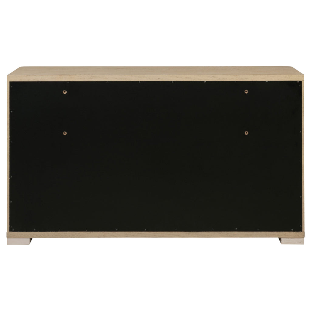 The dresser and mirror set combines function and elegance with its light elm finish and sleek contemporary design. The dresser features six extra-large tinted drawers, each crafted with French and English dovetail construction for durability. Brushed nickel fingertip pulls and rounded corners add refinement, while the matching rectangular mirror completes the look with its clean lines and softly rounded edges, creating a cohesive, modern bedroom ensemble.