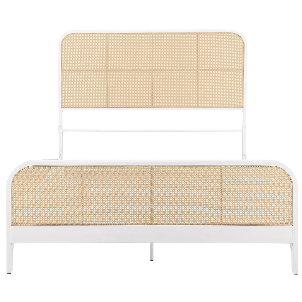 Introduce a touch of modern charm to your bedroom with this stylish metal bed. The bed features a powder coated metal frame with hand-brushed antiqued detailing. Rounded corners and a unique rattan-style woven design on the headboard and footboard. The sleek and sturdy construction ensures long-lasting durability, while the open, airy design adds a sense of space to your room. This bed is perfect for those who appreciate contemporary design with a hint of natural elegance.
