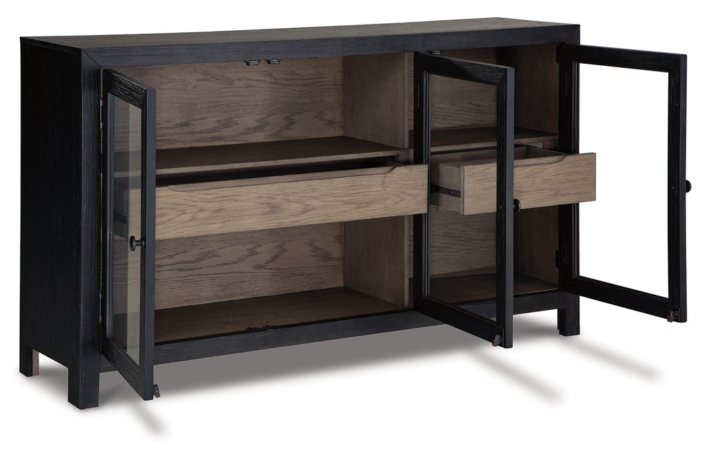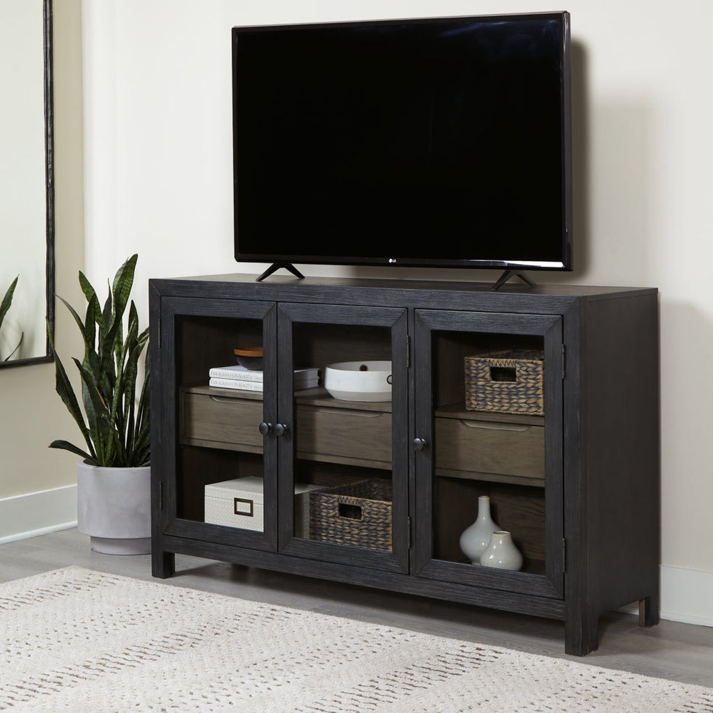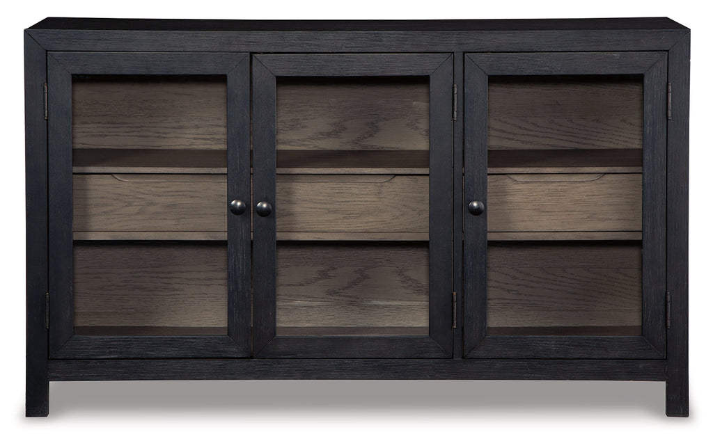 Add layers of form and function to your space with this accent cabinet. It's draped in a black finish on the outside and a warm gray finish inside, for a classic look that seamlessly transitions from casual to modern styles. This accent cabinet's flexible design includes three doors and two shelves for simple and streamlined storage.