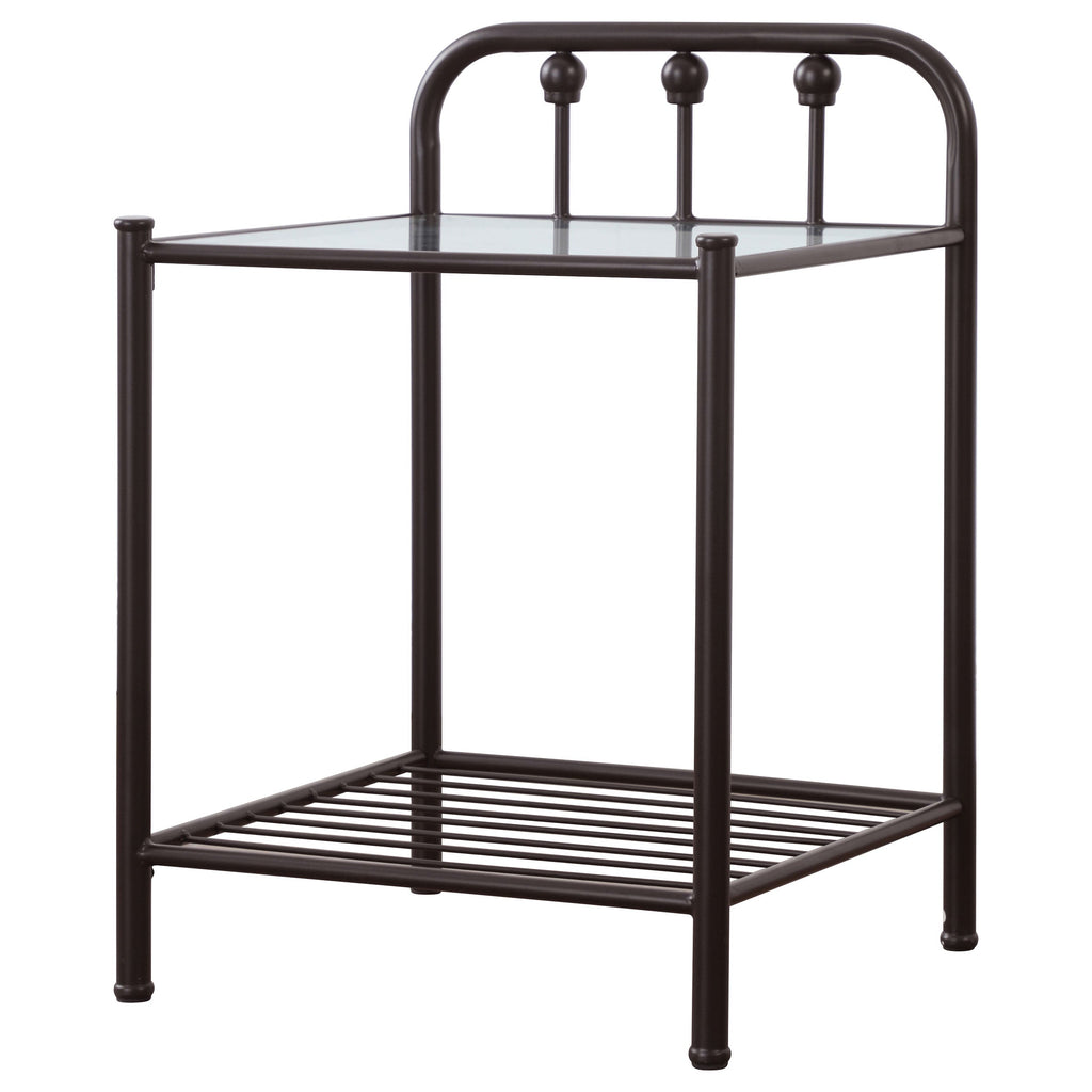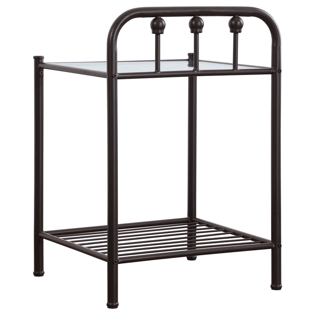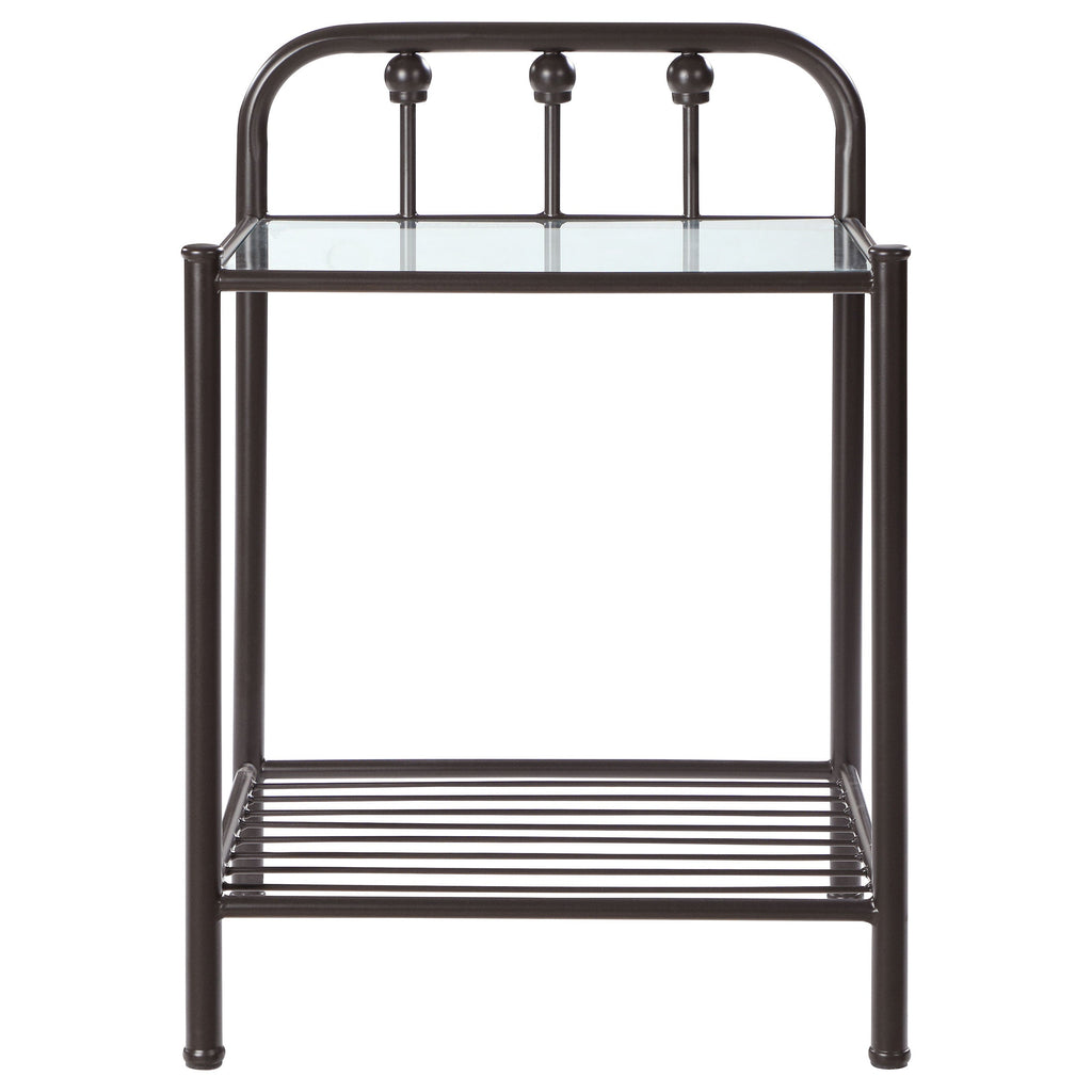 This metal nightstand brings farmhouse charm and functional design to your bedside. Crafted with a dark bronze powder-coated frame, it features a clear tempered glass top for open visibility and easy cleaning. A lower slatted metal shelf adds extra storage for books or essentials. With its vertical rod accents and rounded corners, this table offers durability and vintage character for any bedroom space.