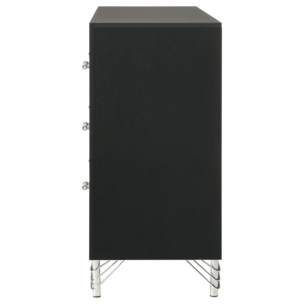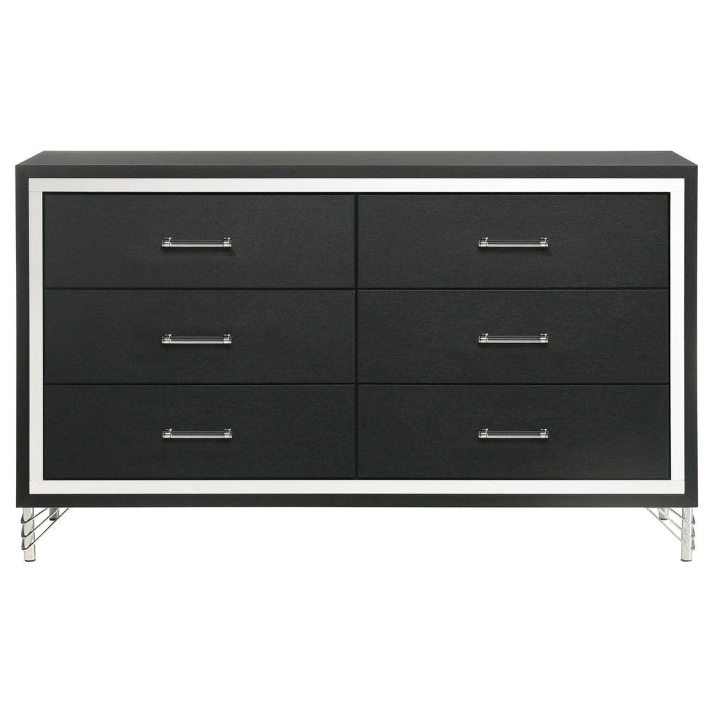 Introduce sophisticated and a hint of glamour with a modern six-drawer dresser and mirror set. Perfect for your stylish bedroom, it offers roomy drawers with smooth interiors perfect for clothing and accessories. The dresser features a bold black finish, with bands of shiny chrome trim and matching hardware and legs. The mirror on top is framed to match the front of the case, creating a sense of cohesion and richness in your dressing area. Decorative legs add a glam touch while the wide top is ideal as a vanity or for decor.