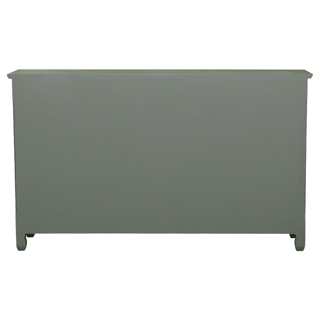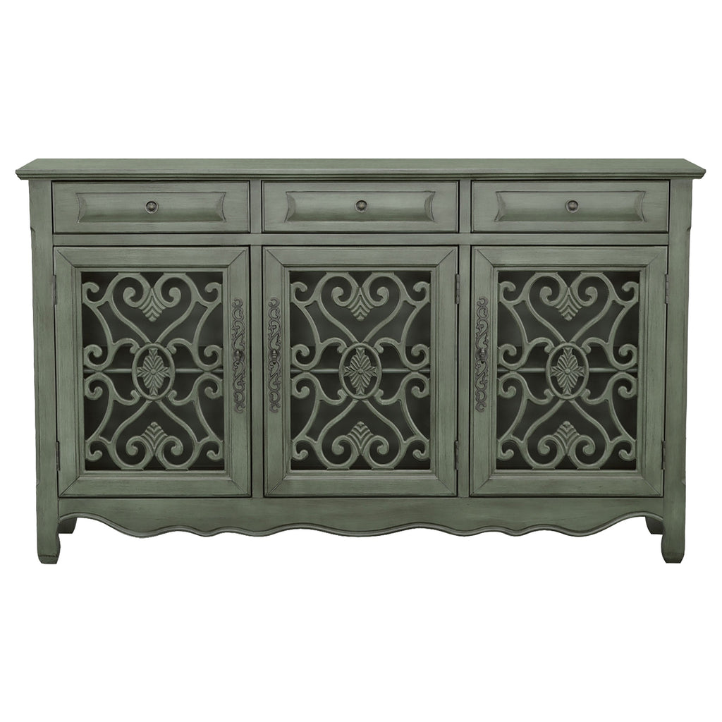 This traditional accent cabinet brings vintage elegance with a romantic twist. Finished in antiqued green, it features intricate bronze hardware, scalloped apron detailing, and sculpted feet. Three doors reveal adjustable interior shelving, while three drawers on full extension glides offer smooth access to linens or flatware. Blending early 20th century charm with cottage-inspired character, it's an ideal piece for entryways, dining areas, or living rooms in need of functional storage with a decorative touch.