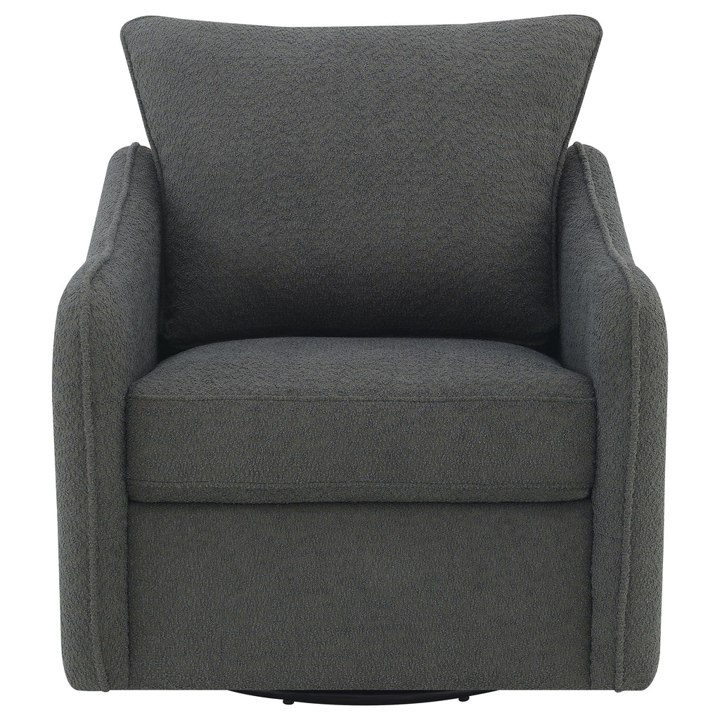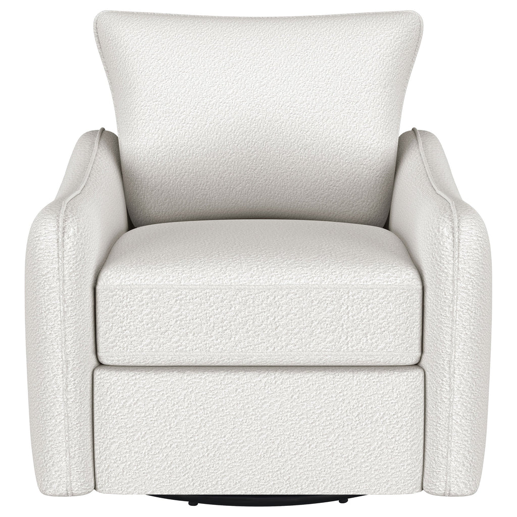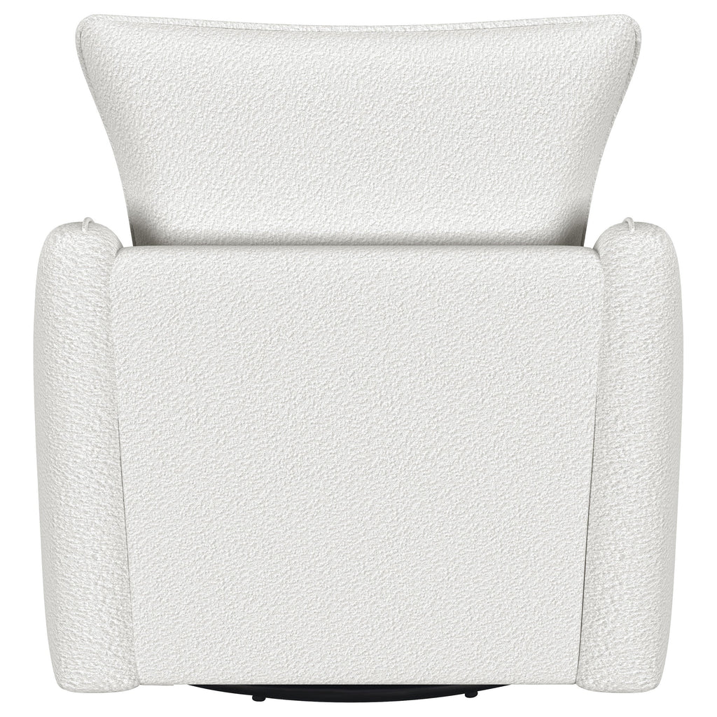 Nestled within the soft embrace of this bouclé upholstered chair, one finds a moment of tranquility. Its harmonious 360 swivel and glider functionality make each movement a fluid dance, a gentle invitation to unwind. The meticulously shaped arms, a testament to refined style, offer a restful perch for weary elbows. As the day's light fades, this chair becomes a cherished haven, its silhouette a blend of comfort and contemporary charm. In this cozy nook, time slows, and serenity takes a seat.