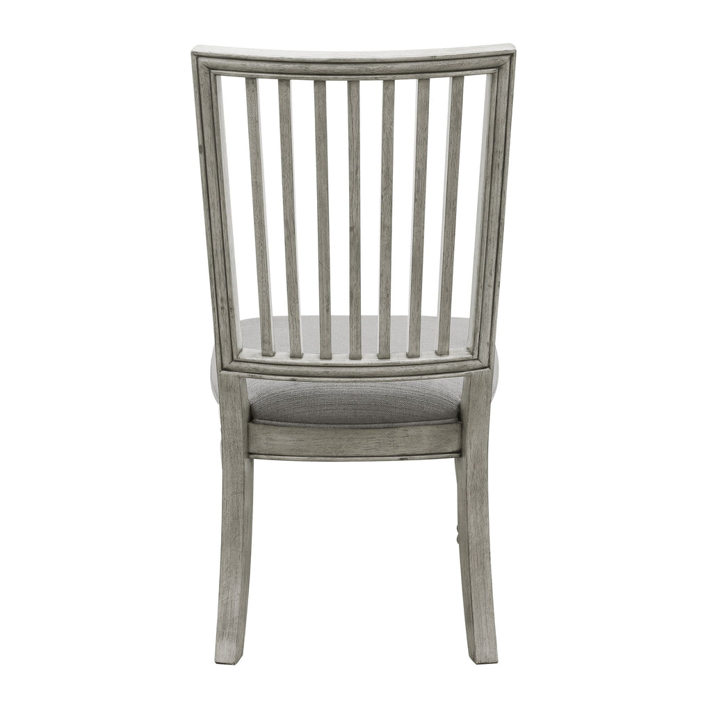 A great dining experience requires a great chair. This one borrows from traditional designs and updates them with a buff gray finish that lets the wood grain show through. Turned front legs and the slat back hark back to gathering around a great farm table and padded upholstered seats provide comfort and support.