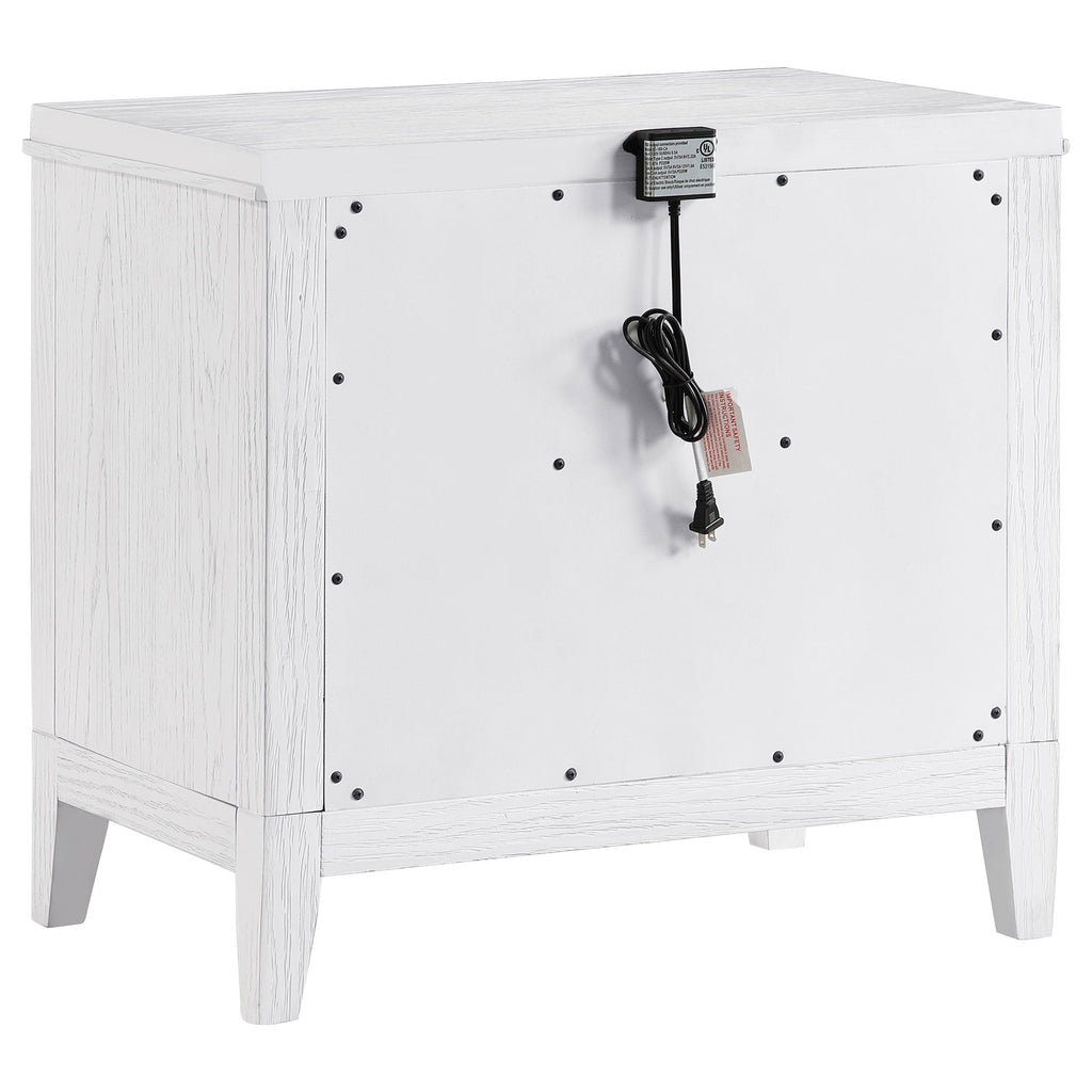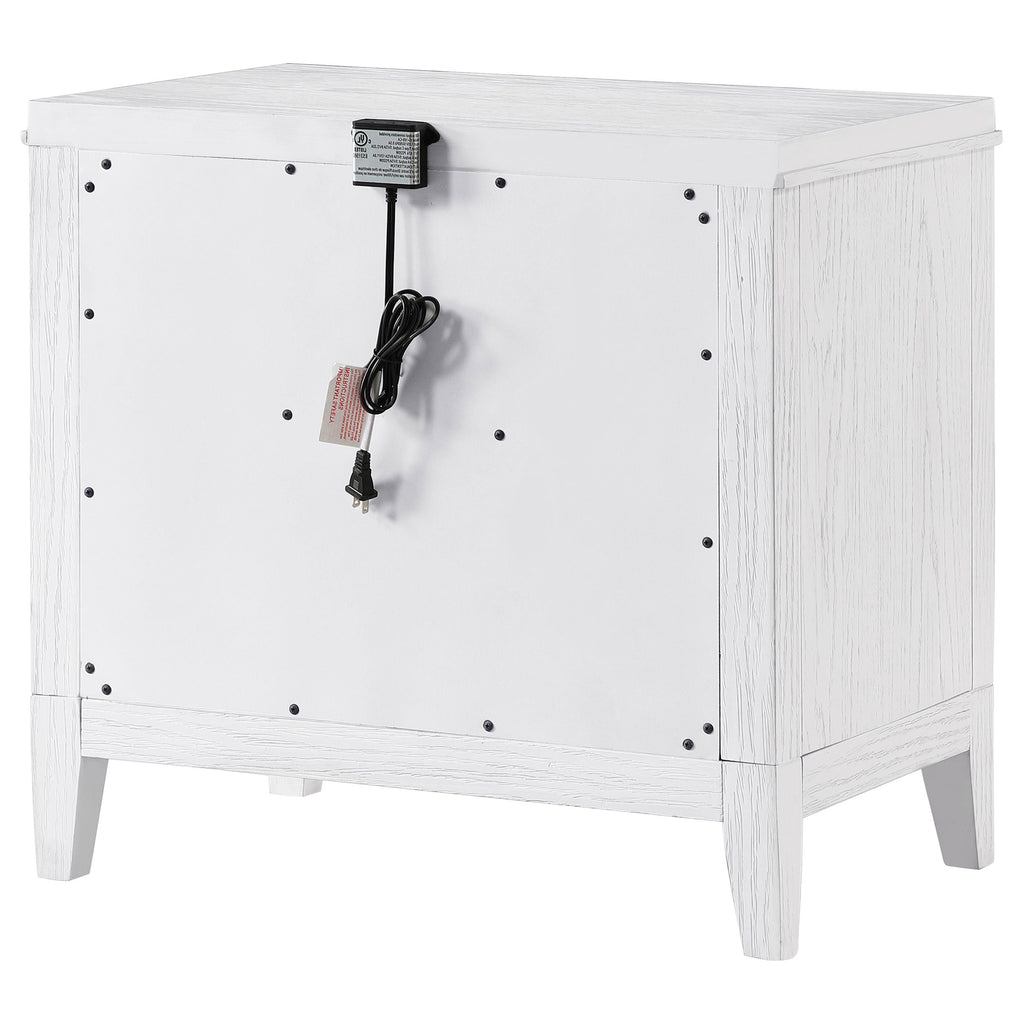Bring fresh perspective to your bedside with a modern two-drawer nightstand. Its casual style and classic stance create a restrained look and feel, perfect for a soothing bedroom space. It features a distressed white finish over wood grain, creating subtle depth and detail. Drawers are roomy for bedside essentials, and stepped fronts add character and dimensionality. Contrasting antique brass toned bar pull complete the look, offering stylish allure in your stylish bedroom.
