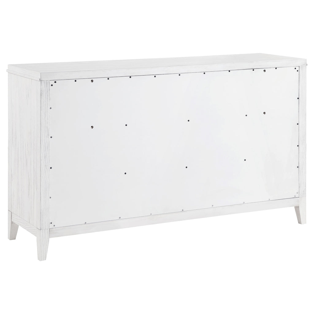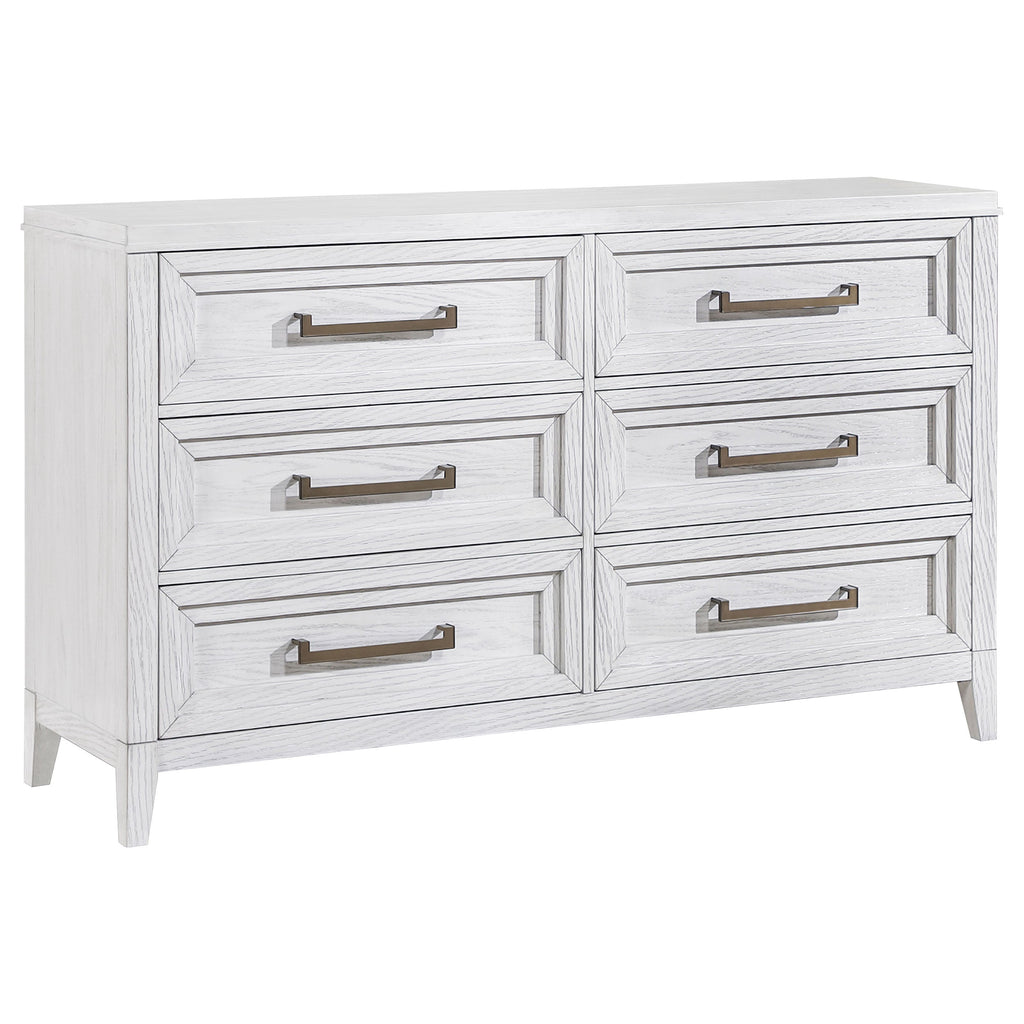 Light distressing offers depth and dimensionality to a modern six-drawer dresser. Perfect for clothing and other accessories, it features a double profile with three drawers on each side. A white finish allows wood grain details to show through, creating organic character and texture. Drawer fronts are a stepped design that adds artistry, with long antique brass toned pulls that add contrasting depth. use the wide top for personal effects like a jewelry box or valet and framed photos.