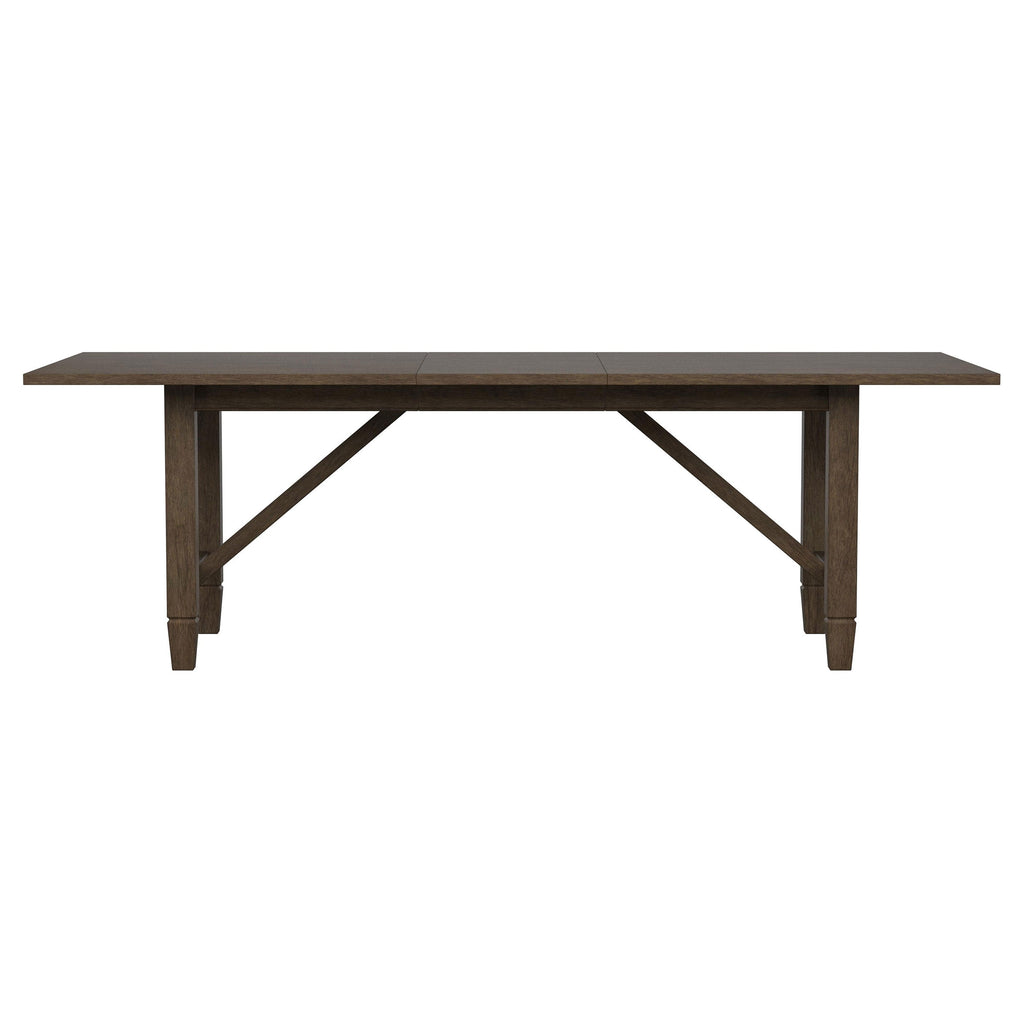 Set the tone in your stylish home with the welcoming ambiance of a modern farmhouse dining table. The rectangular table features a clean, streamlined silhouette complete with a recessed apron and decorative diagonal braces that bring architectural appeal. The table offers a natural wood finish to highlights its beautiful mahogany and Asian hardwood construction and veneers. The tabletop expands with the addition of the leaf, which measures 18-inches across to add seating for two more of your favorite people. Tapering feet are a subtle finishing touch, defined with linear trim that adds the perfect dose of dimensionality.