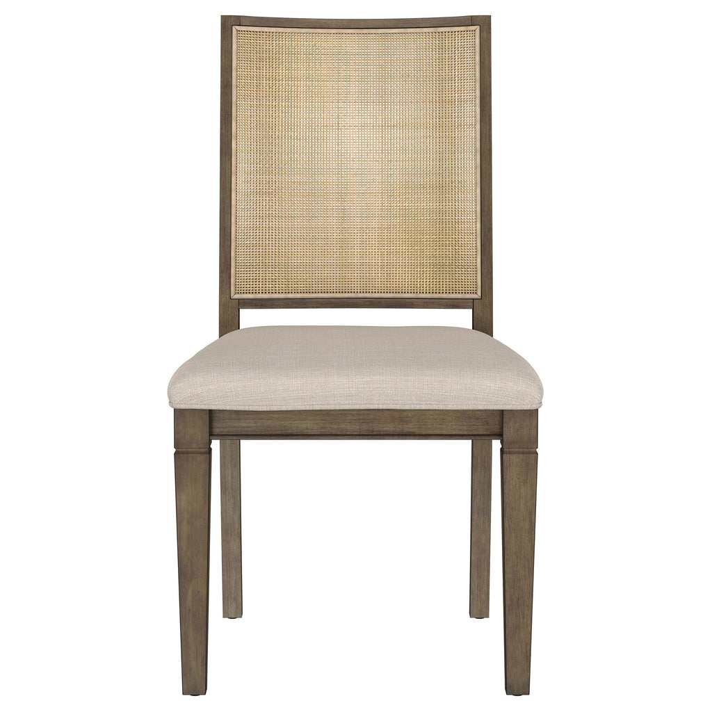 A trio of natural hues brings refined but casual character to a modern farmhouse dining chair. Perfect for friends and family enjoying delicious meals, the chair features a plush foam seat with beige upholstery. Its back is rattan, adding texture and character while maintaining a light, airy look and feel that's rich and breathable. Its classic stance features an armless silhouette complete with a gently angled back and straight, tapering legs. The natural finish of the wood offers a refined but accessible look, perfect for inviting family spaces.