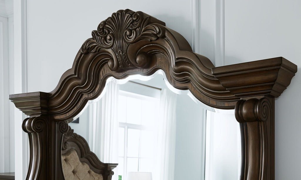From the ornamental appliques to the large scale, this dresser and mirror make a bold statement. Spacious drawers store your clothes, jewelry and more in stunning style. The look is timeless. The feel? Right at home.