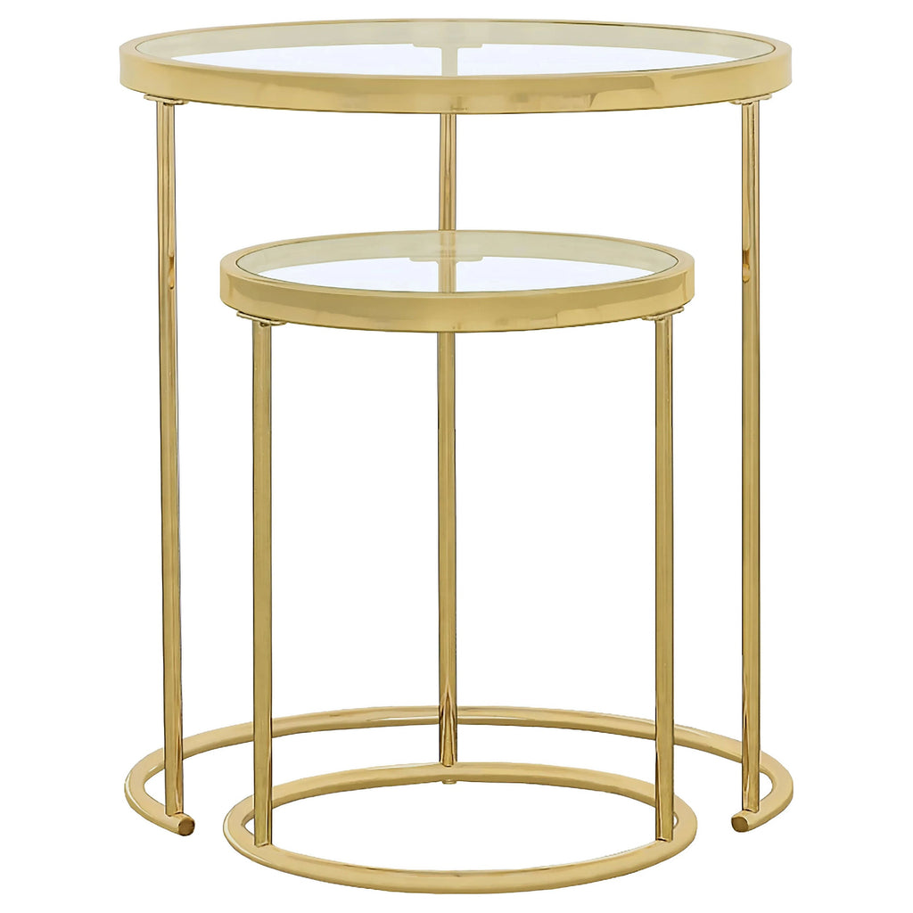 Elevate your living space with this stylish two-piece nesting table set. Featuring clear tempered glass tops and a sleek gold electroplated steel frame, these round tables provide both convenience and modern elegance. The clean, minimalist design seamlessly blends into various decor styles, offering functionality and sophistication. Ideal for small spaces, these nesting tables allow you to easily organize your items while adding a touch of luxury to your home.