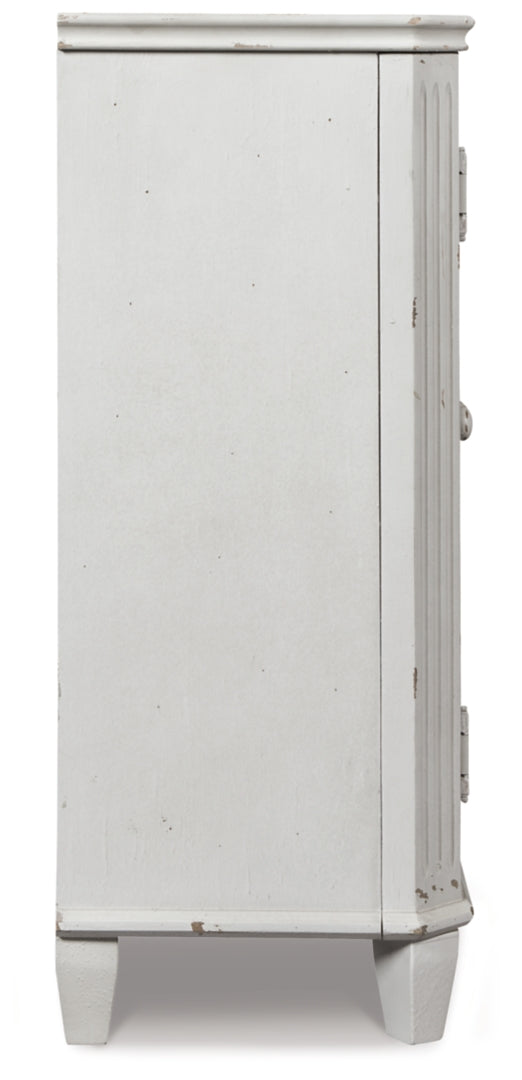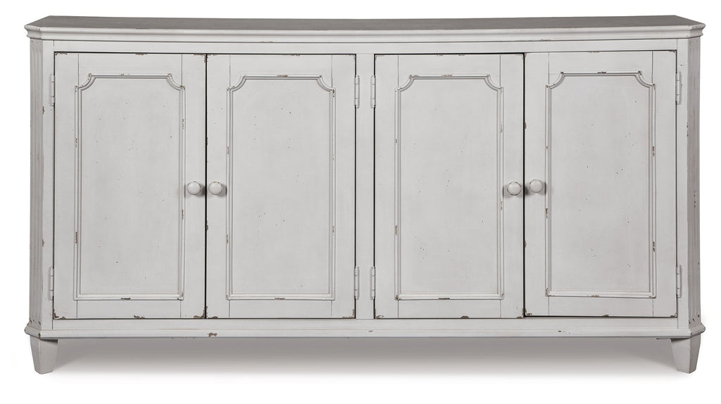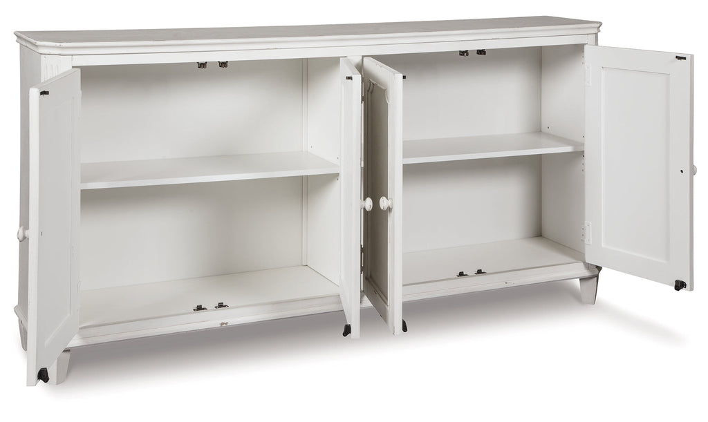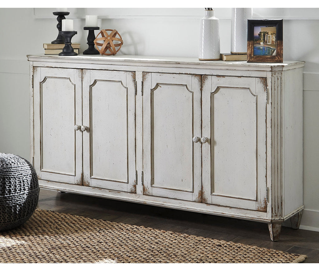 With its distressed vintage paint finish, fluted details and French provincial mouldings, this exquisite cabinet is sure to grace your space in such a très chic way. Adjustable shelved storage is abundantly practical, be it in a dining room, living room or entryway.