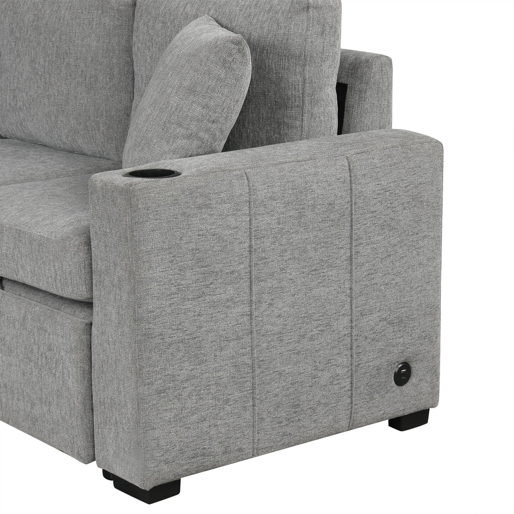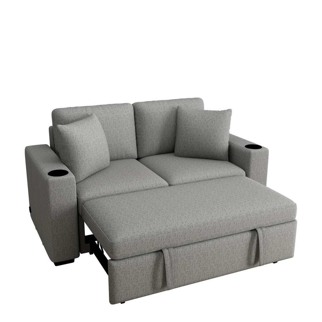 2 Seater Loveseat Sofa With Pull-Out Bed, Built-In USB Ports & Cup Holders - Gray