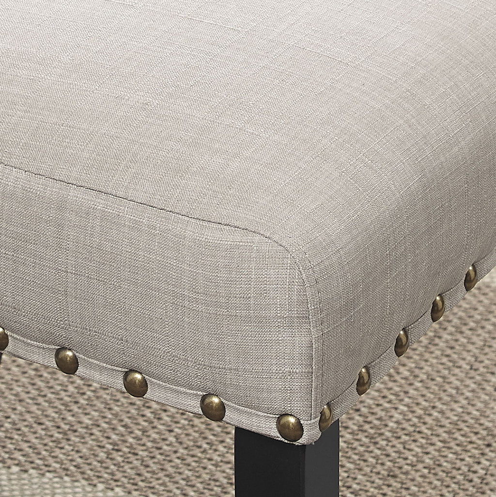 - Elegant and Cozy Atmosphere: Round table with stable cross-buck pedestal base in black finish. Chairs feature fabric upholstery with brass nailheads for a timeless look.