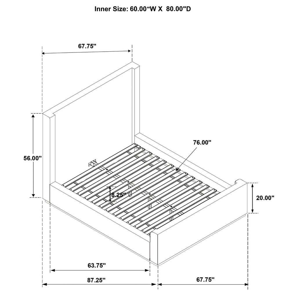 Eastern King Bed: Width: 82.75, Depth: 88.25, Height: 56.50, Weight: 176.36