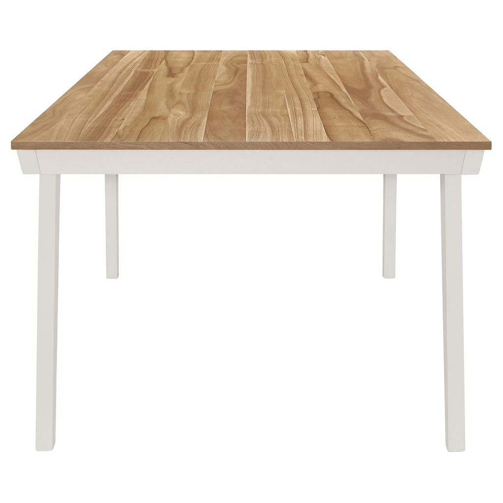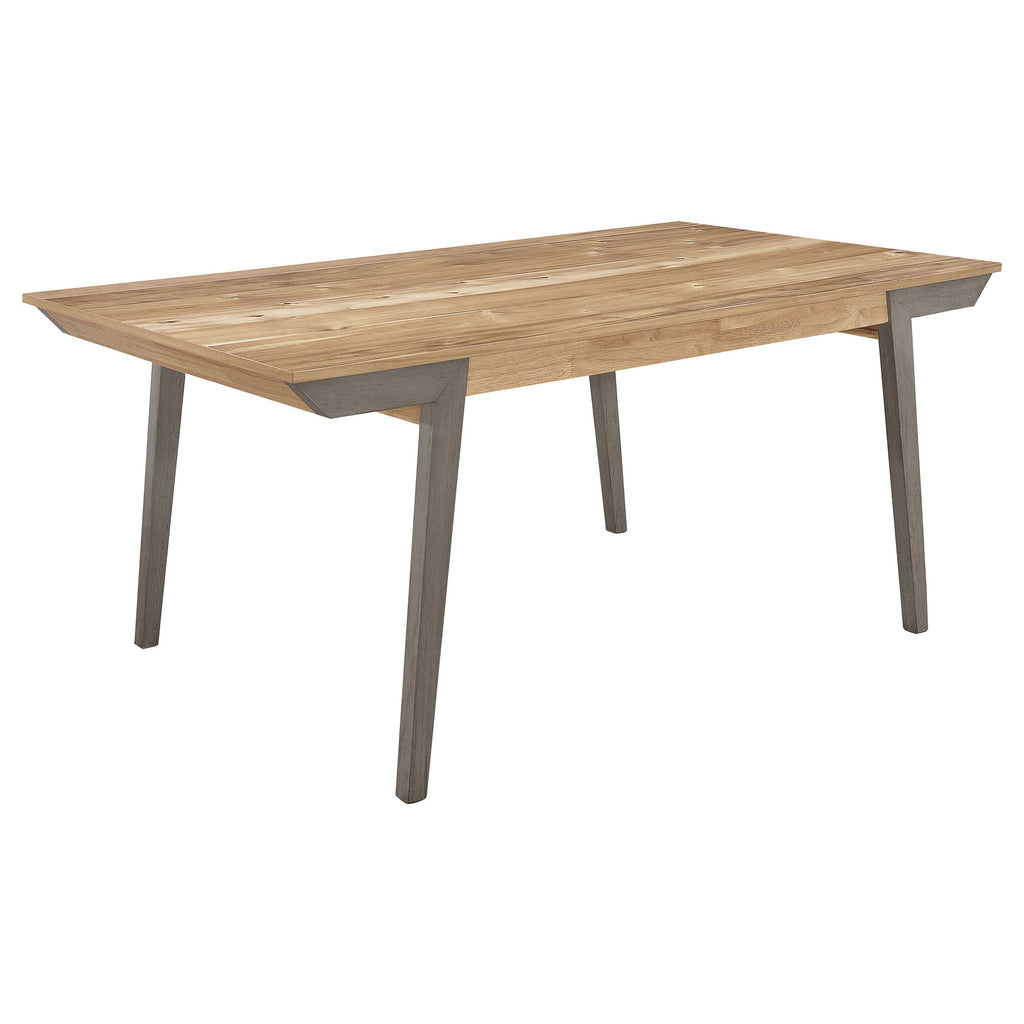 A classic farmhouse design gets a modern update in this gorgeous, wooden dining table. This tasteful piece boasts a spacious, rectangular surface with plenty of room to spread out. The top showcases natural wood grains for a cool, country vibe. A grey leg finish completes the design, giving it an eye-catching, two-tone look. This beautiful, wooden table creates a sturdy and stylish setting for casual family meals.