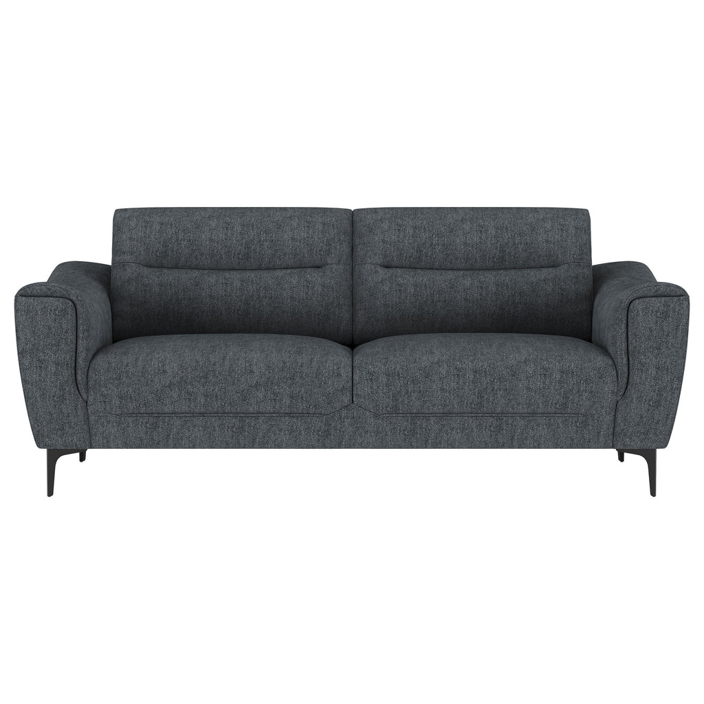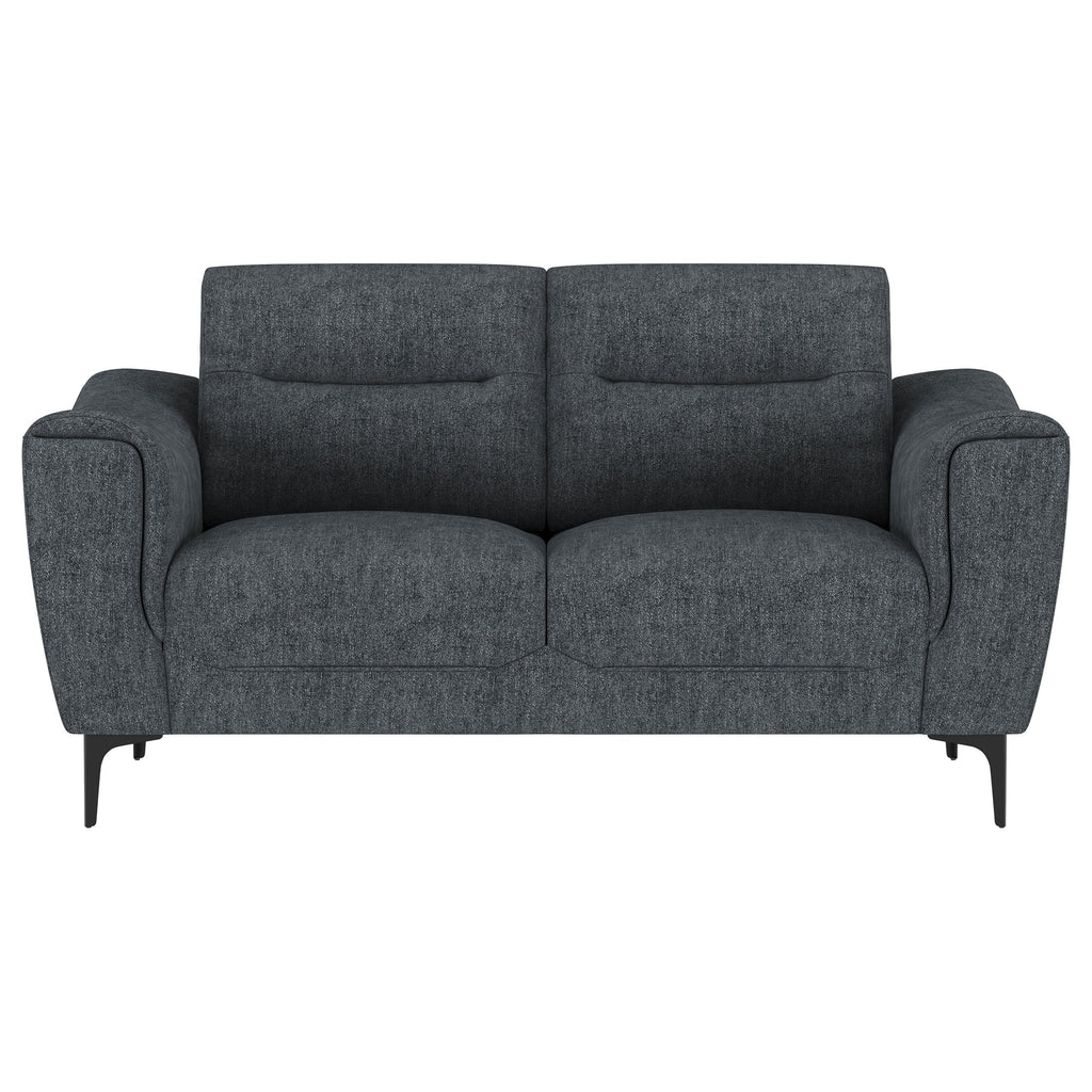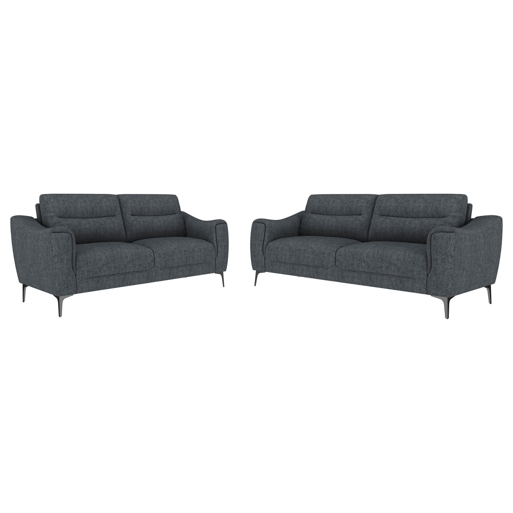 Indulge in effortless style and comfort with this chic transitional sofa set. Soft charcoal upholstery gracefully harmonizes with any décor, while plush pocket coil seat cushions and modern track arms provide inviting support for your downtime. Designed with attached cushions for a neat appearance and innovative metal legs that allow for easy assembly, this collection elevates the overall ambiance of your living space.