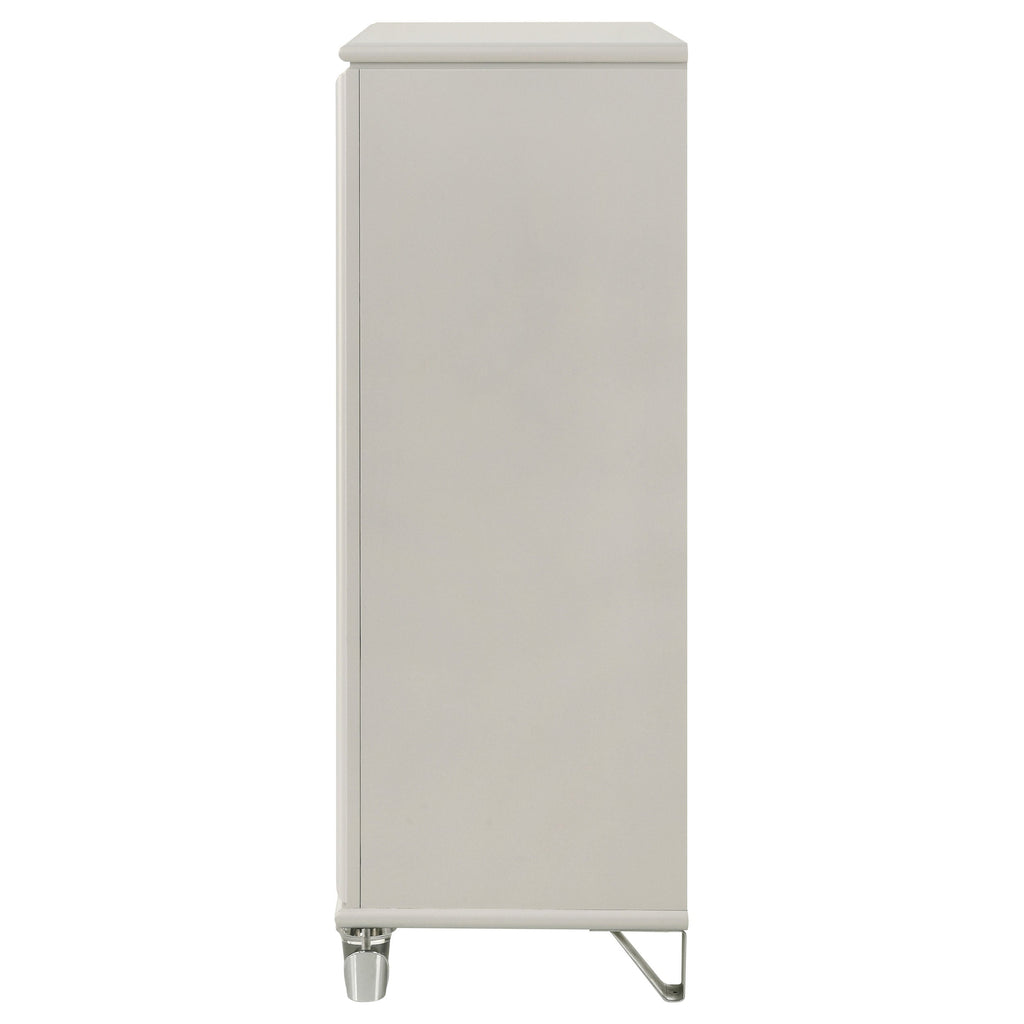 Discover elegance and functionality with this beautifully crafted chest, designed to complement your bedroom suite. The pearl white finish, highlighted by the unique diamond star drawer fronts and chrome metal pulls, exudes a contemporary charm. Acrylic feet with polished chrome caps add a touch of sophistication. Offering ample storage, this chest keeps your space organized while enhancing your room’s aesthetic. Experience the perfect blend of style and practicality with this exceptional piece.