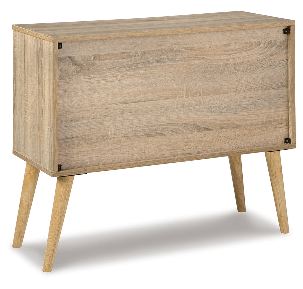 Open the door to clean-lined form and functionality with this accent cabinet. Its homey natural finish is enhanced with crisp white doors and pulls. Adjustable shelf caters to your needs.