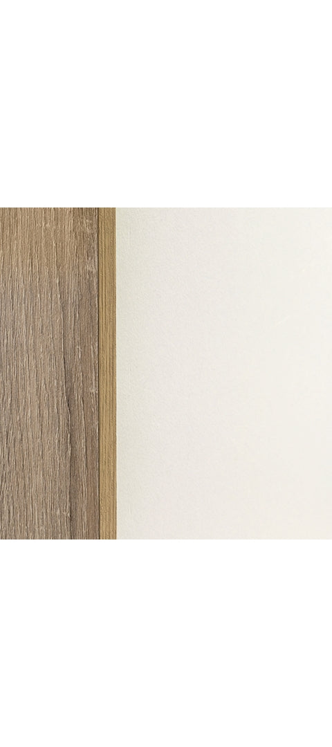 - Two-tone; white and replicated natural wood grain finish
