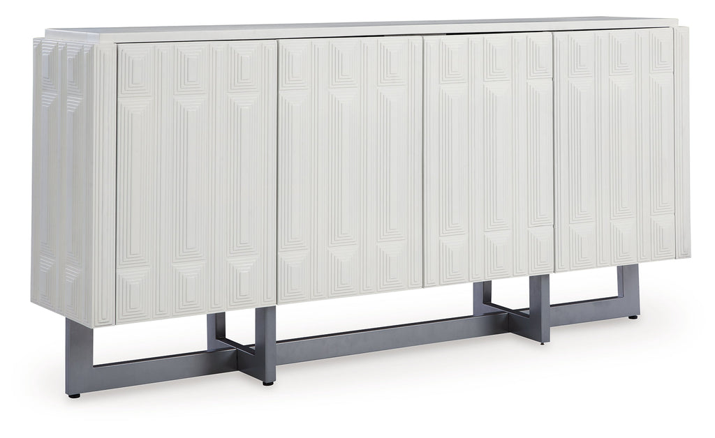 Keep things contemporary cool with the Ornawel accent cabinet. The step pattern on the door fronts lends an appealing geometric touch, with a lightly distressed white finish enriching the design. Touch latch doors open to reveal two shelves for all your storage needs. What a high-style statement.
