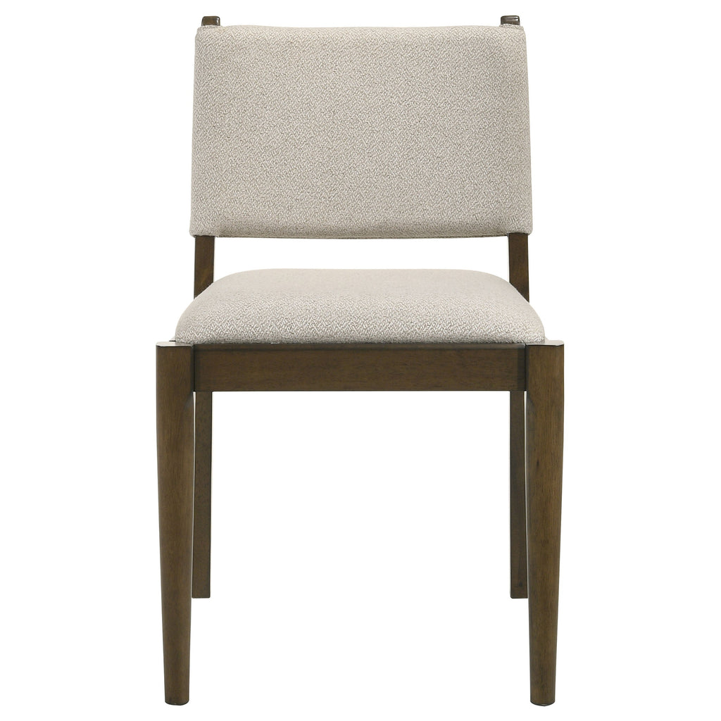 This stylish dining chair merges modern design with elegant craftsmanship. Featuring a wrapped backrest accented by unique brown tie detailing on the back, it adds a sophisticated touch to your dining space. Upholstered in soft light tan fabric, the chair provides comfortable seating with foam-padded support. The tapered legs in a rich brown wood finish complement the overall design, ensuring both durability and charm. Perfect for transitional or contemporary dining areas.