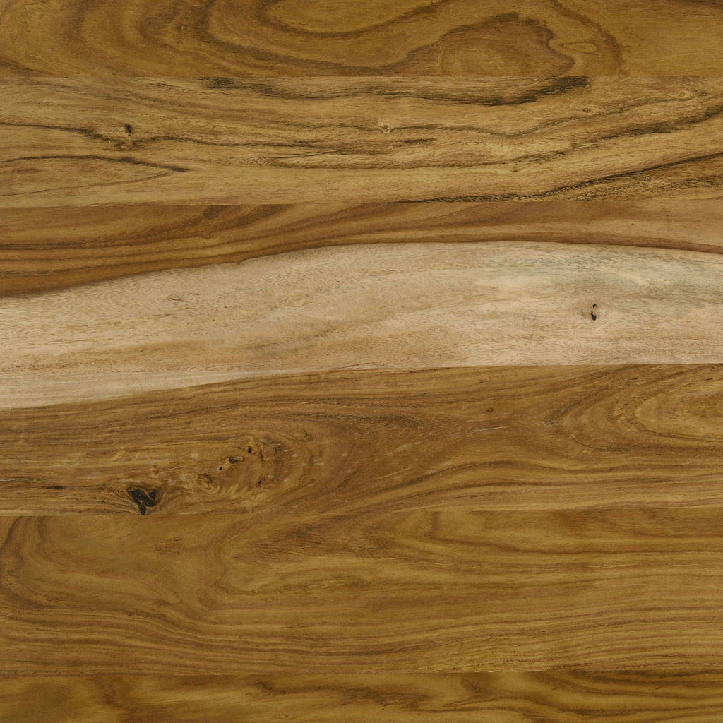 A perfect addition to contemporary homes, this mid-century style counter height table creates a warmth to a dining area with its solid natural Sheesha wood frame. Graceful curved edges and a 45-degree chamfered profile lend a softness and elegance to this furniture piece. Along the apron of this charming contemporary dining piece is an arrow-inspired graphical design in a contrasting black hue that lends a playful touch. Supported by long slender legs that taper toward the feet, this counter height table pushes the vintage vibes. Pull up a counter height stool or chair to seat six family members or guests comfortably.
