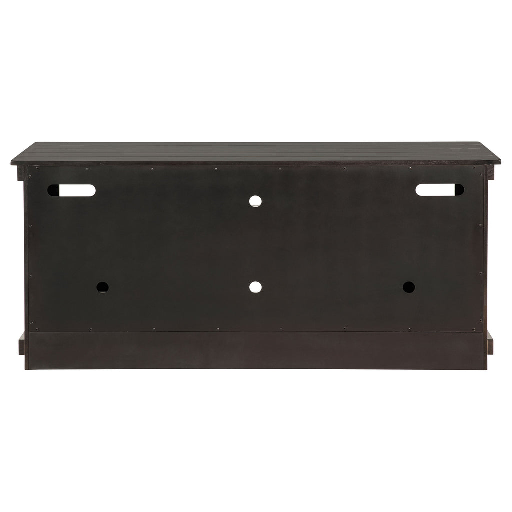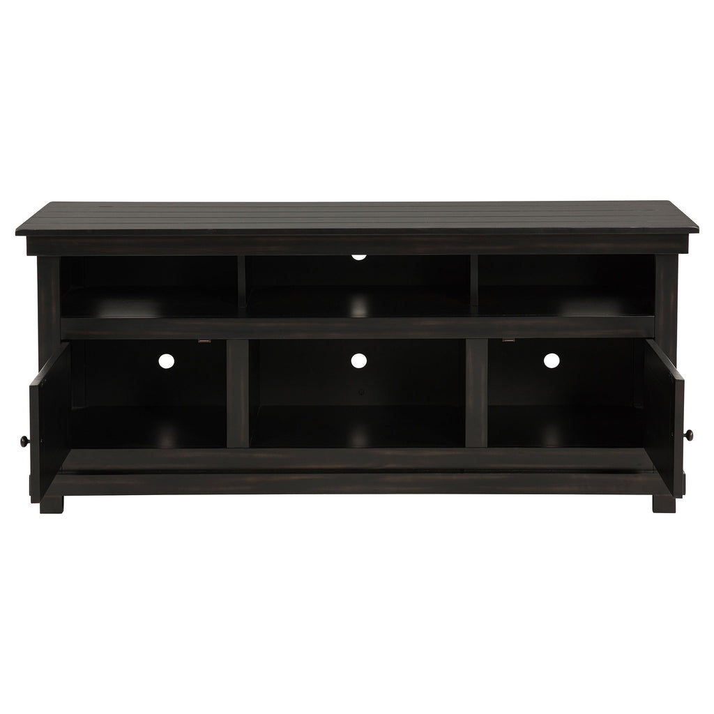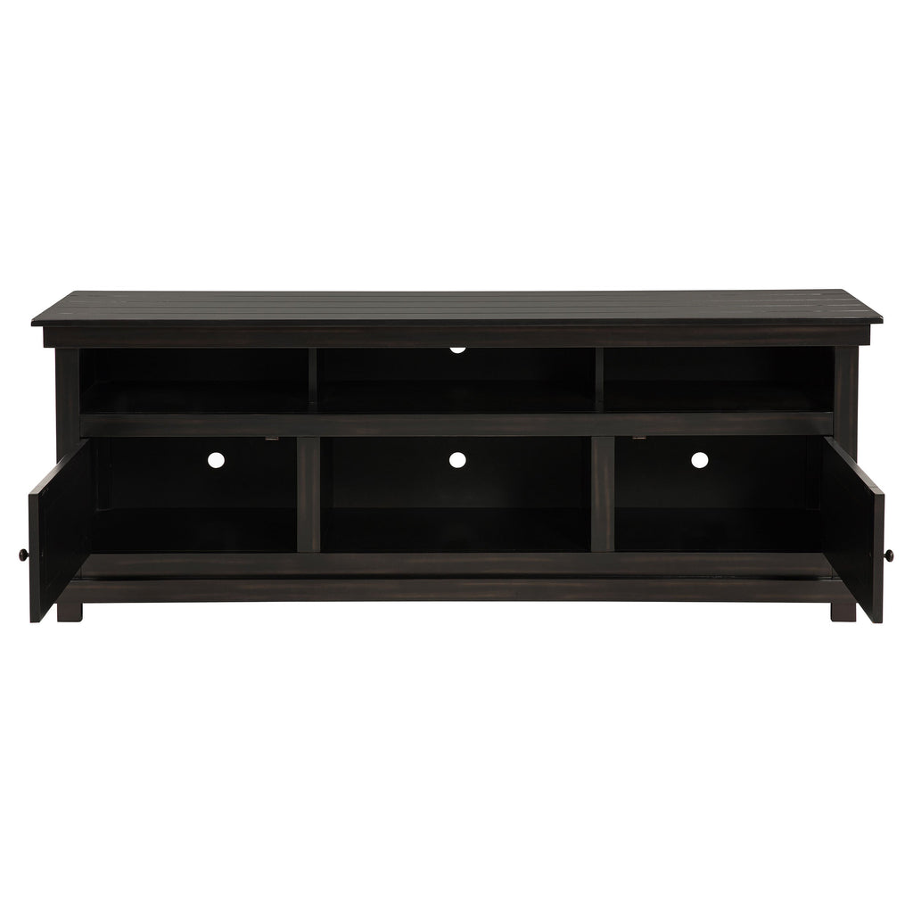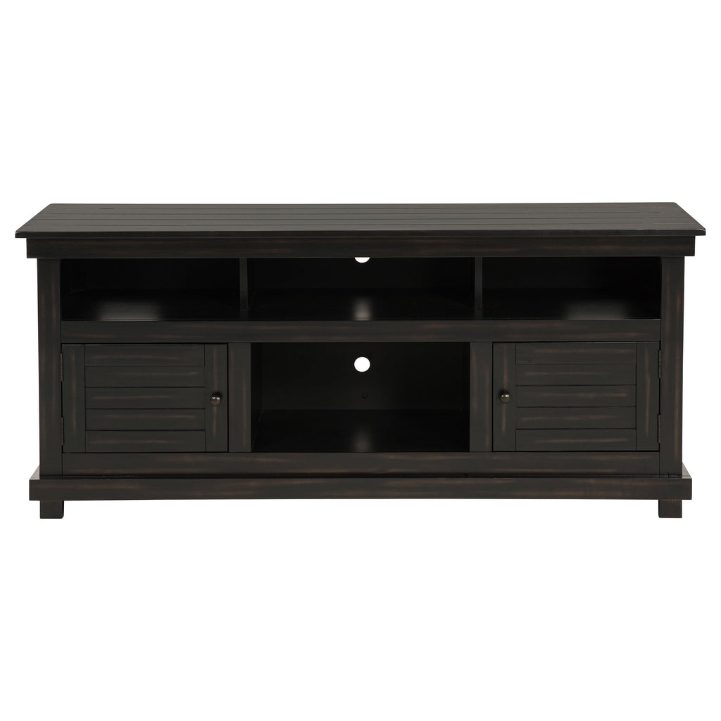 Complete a media center in your inviting home with a modern farmhouse TV stand. It's an approachable design with roughhewn wood details that create texture and dimensionality in your living space. Two shelves and 6 compartments create ample storage, perfect for everything from peripherals and accessories to personal decor. The media console features a clean-lined silhouette with a slim profile, perfect for a flat panel or wall-mounted television. This TV stand accommodates televisions up to 65 inches.