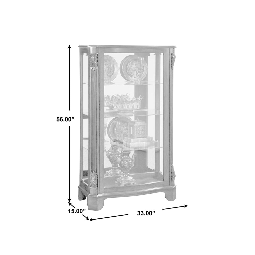 This display cabinet draws it's appeal from tried and true traditional styles like the acanthus leaf accents, reeded posts, gently curved shaped front and rich deep cherry finish. It is not so tall so you have the opportunity to add a piece of art ormirror above.