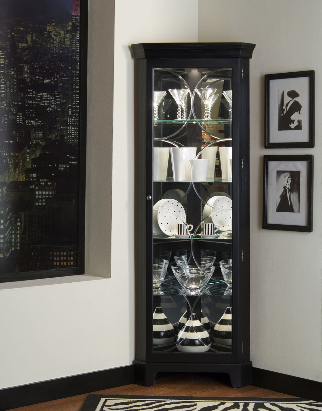 There are many ways to display your favorite objects. If you enjoy refinement and wish to place your curio in a corner, this design is for you. Classic tracery patterns are incised into the front glass to give the curio a distinctive personality. Thiscorner curio is solidly built in select hardwood solids and veneers with our deep Oxford Black finish. It features a mirrored back, high-low halogen lighting, four adjustable glass shelves, adjustable glides for leveling, and a front-opening door.