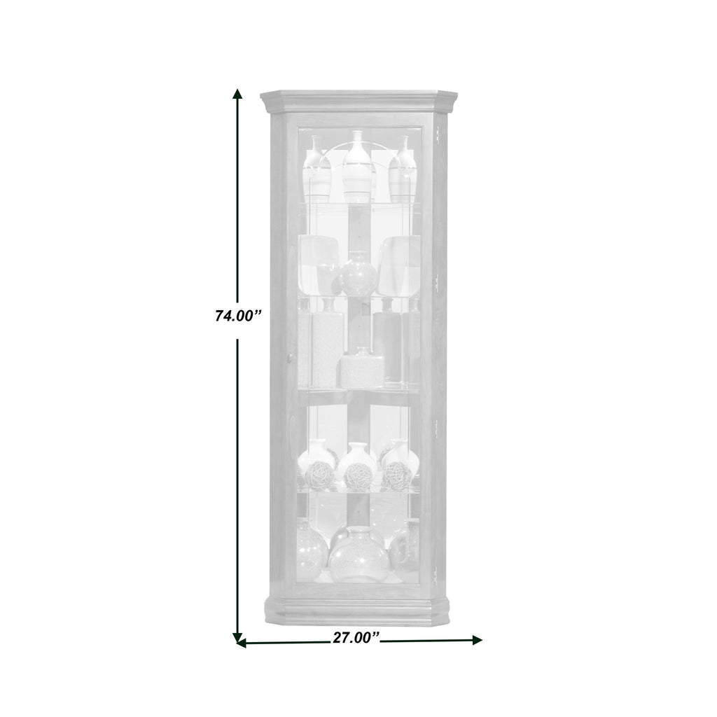 - This corner Curio features a mirrored back, high-low halogen lighting, four shelves, adjustable glides for leveling, and a front-opening door.
