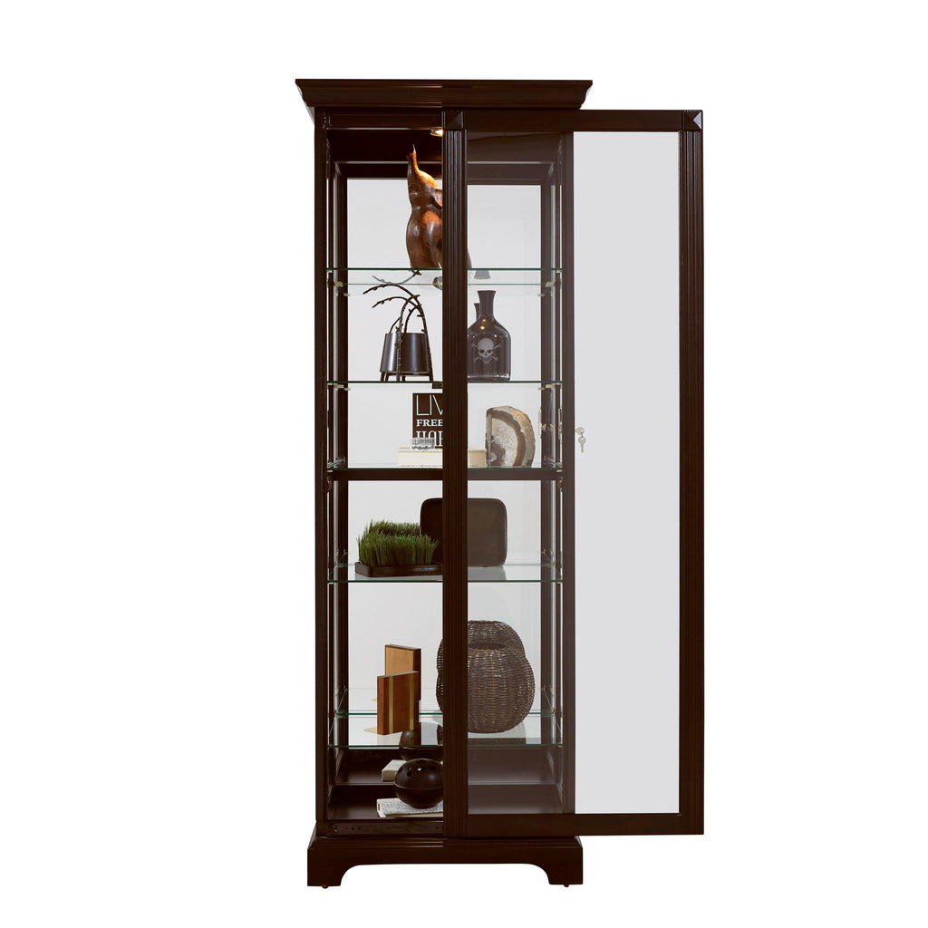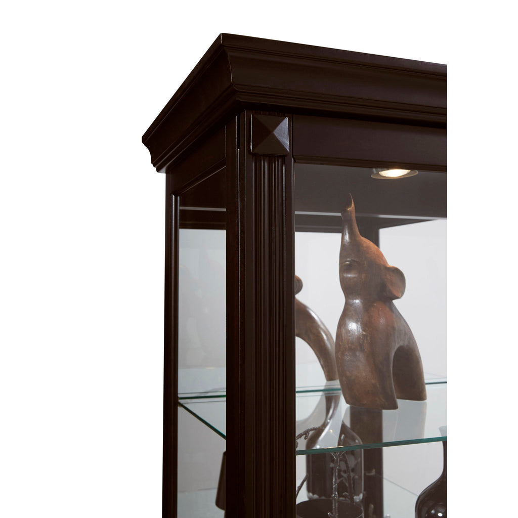 This display curio offers both high-end style and a roomy interior for your treasured collections. The dark cherry brown finish uses wood rub-through and simple design elements to reflect a transitional style that works well with any decor. The front of the case is constructed with a two-way sliding door with a lock for security, while a mirrored interior back allows you to view contents from any angle Five adjustable glass shelves offer customized storage and display, and a single halogen can-style light clicks on with a roll-switch for nighttime viewing. The case is decorated with reeded pilasters and diamond-shaped carvings at the top for added elegance.