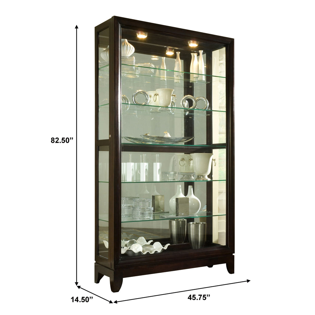 Some household pieces are as lovely as they are practical, and the beauty they can add to a home is yours for the arranging. Our tall curio is solidly built in select hardwood solids and veneers and a deep Chocolate Cherry finish that gives a fresh and bright appearance. This curio has a two-way felt-lined sliding door with lock. It includes beveled glass on the front, a mirrored back, halogen lighting, adjustable glassshelves, and adjustable glides for leveling.