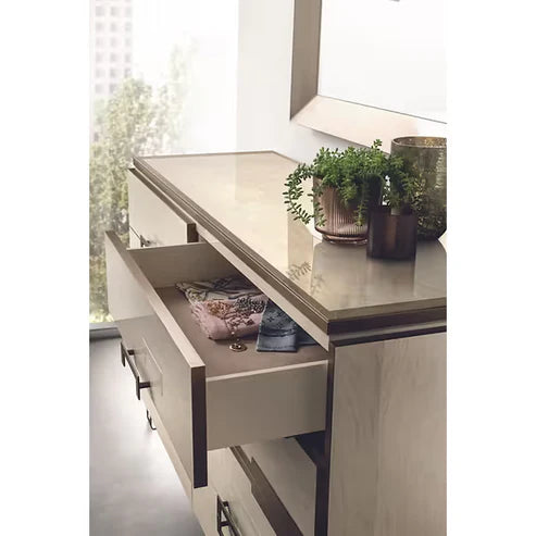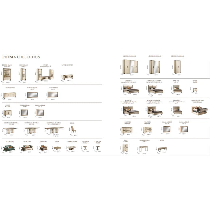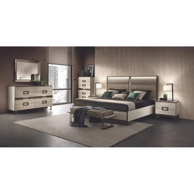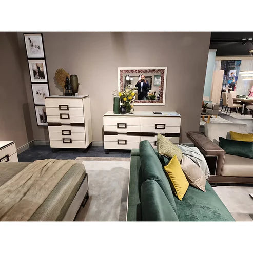 The Poesia Collection represents the pinnacle of Italian design, blending structural "Linearity" with the "Softness" of high-end upholstery. This set is a sophisticated fusion of Glossy Ivory Marble finishes and Emperador Dark glass accents. The centerpiece is the Upholstered Bed, which features integrated LED lighting, creating a glowing halo effect against the textured fabric and warm bronze hardware. It is a collection designed to turn the bedroom into a cozy yet bold sanctuary of style.